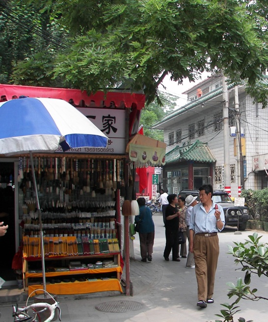 Al salir, de inmediato nos damos cuenta de el cielo gris, producto de la contaminación y el "smog", casi no se puede apreciar el hotel al fondo. Como es verano, se pueden apreciar muchas flores en los jardines. Compré unas brochas y un pergamino con mi nombre escrito en chino, en la parte antigua, el Ox Street Mosque, es la parte más vieja y el centro del barrio Musulmán. Aquí se encuentra la mezquita más antigua y grande de la ciudad, la Niujie Libaisi (Mezquita de la Calle del Buey), así como una variedad de restaurantes halal, carnicerías y supermercados. Niujie no es solo una calle; es un centro cultural donde generaciones de musulmanes han vivido, trabajado y practicado su culto, preservando sus tradiciones y patrimonio. Javier Carrión compró un abanico, con unas letras pintadas a mano, que luego usaría el resto del viaje para sobrellevar el tremendo calor del verano en China.