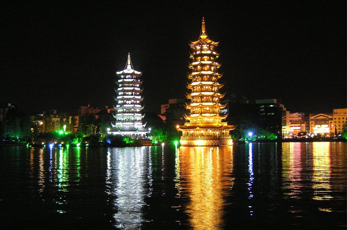 En Guilin el principal atractivo son dos torres en el lago, una dorada y otra plateada, realmente preciosas de noche. Sus calles son una sucesión colorida de negocios de ropas, artesanías y regalos.