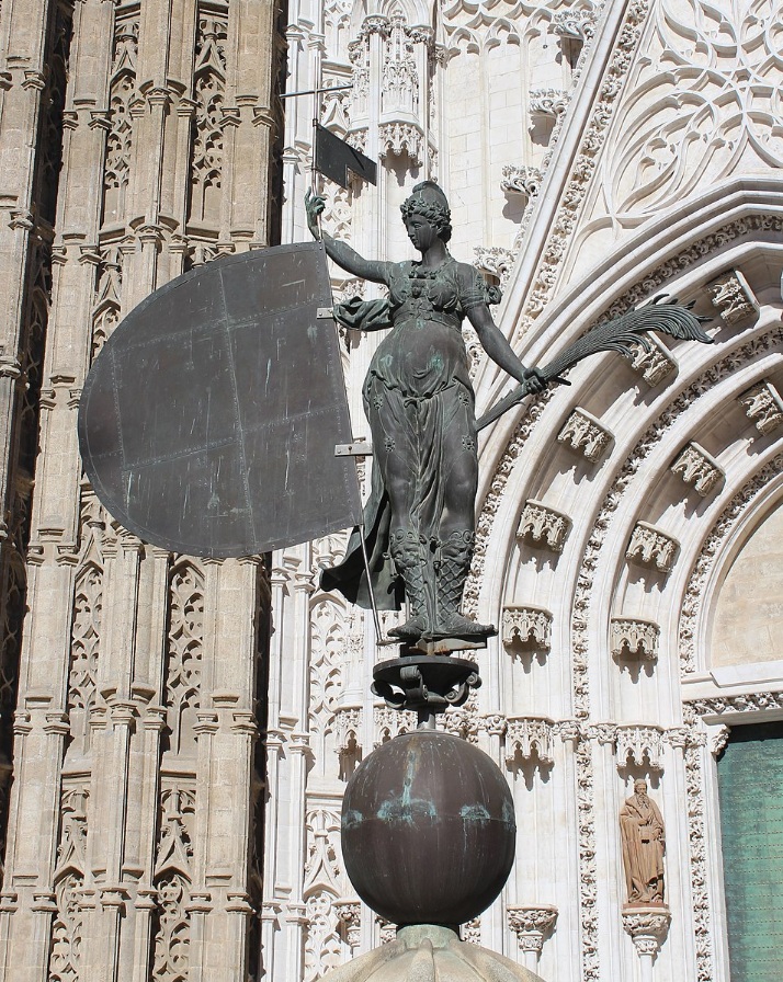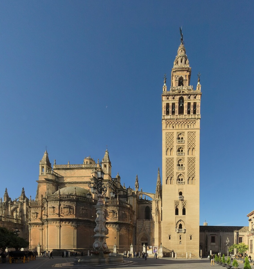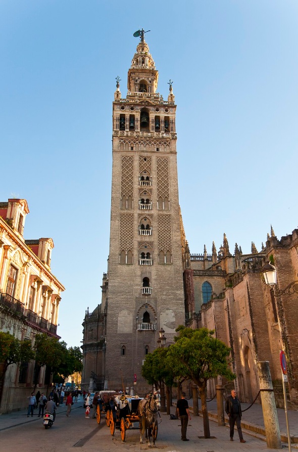 La Giralda es la torre campanario de la catedral de Santa María de la Sede de la ciudad de Sevilla, en Andalucía (España). La parte inferior de la torre corresponde al alminar de la antigua mezquita de la ciudad, de finales del siglo XII, levantado en época almohade, mientras que la parte superior es una construcción sobrepuesta en el siglo XVI, en época cristiana, para albergar el cuerpo de campanas.
