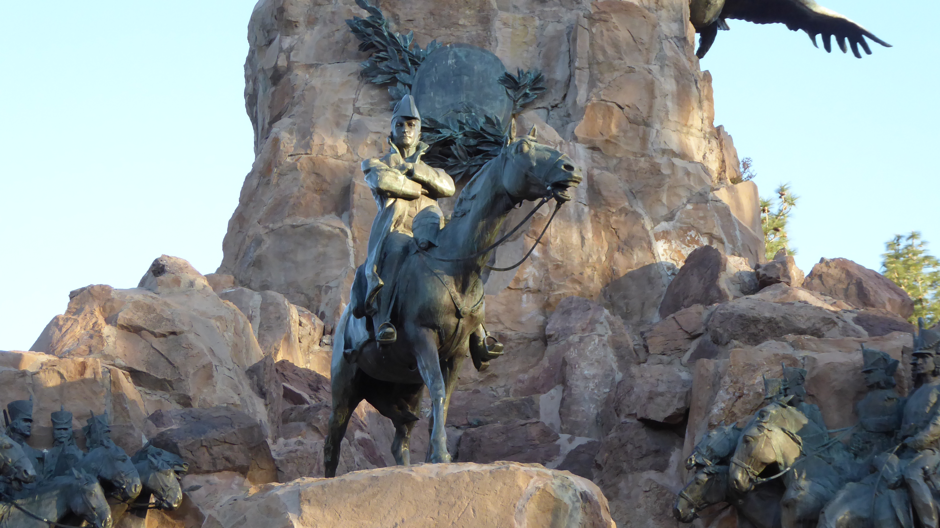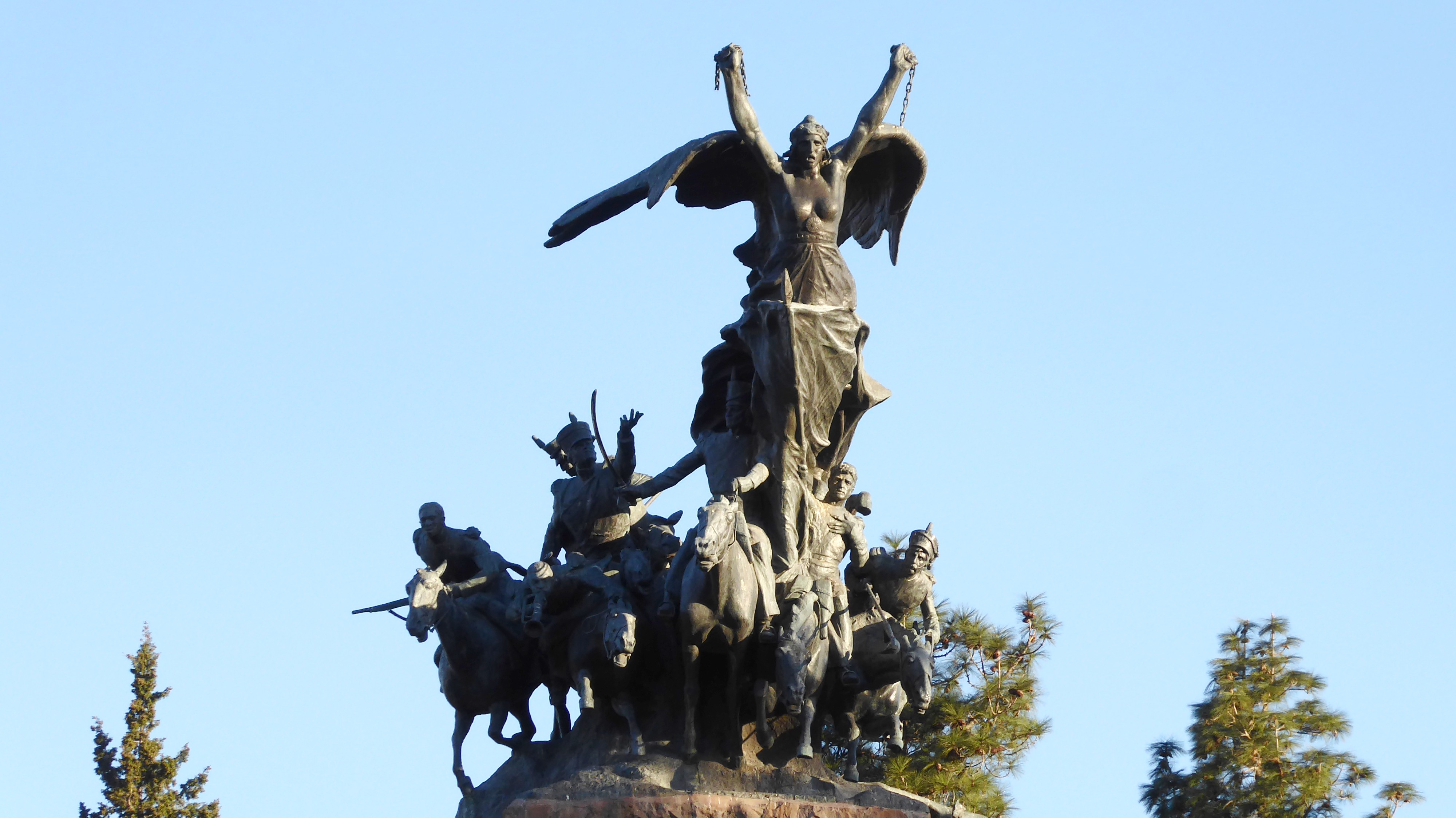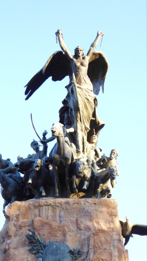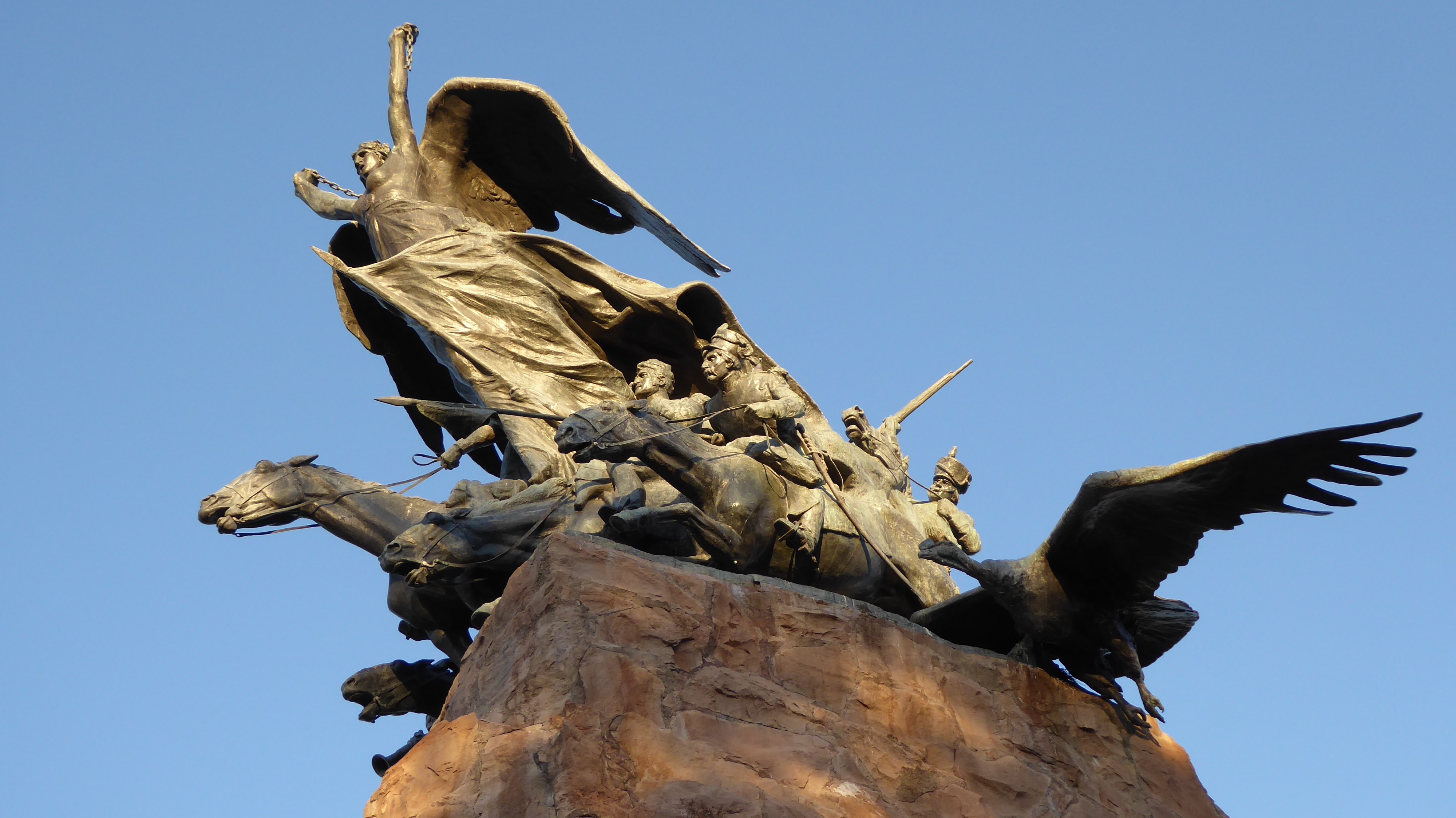con su brazo extendido dominando los mares. También se ve el Museo Nacional de