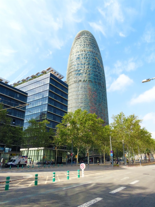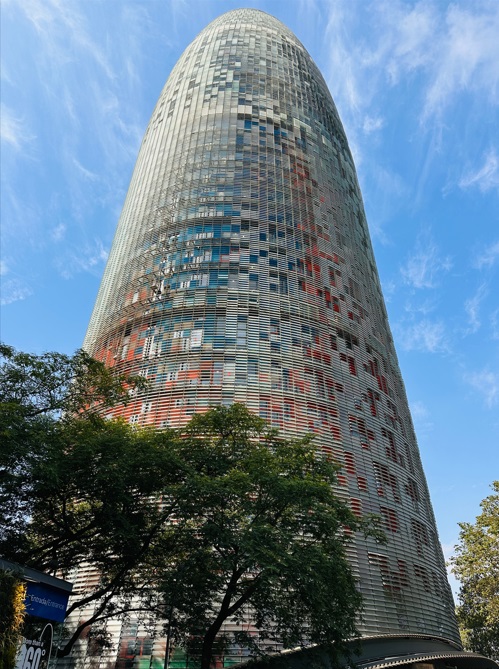 El edificio, con sus 144 metros de altura, lo convierten uno de los más altos de la ciudad. Lo cubre un muro de cemento, y una chapa de aluminio le da esos colores con tonos tierra, rojo, azul, verde y gris. Definitivamente es un símbolo de Barcelona que vale la pena visitar. El arquitecto fue Jean Nouvel.