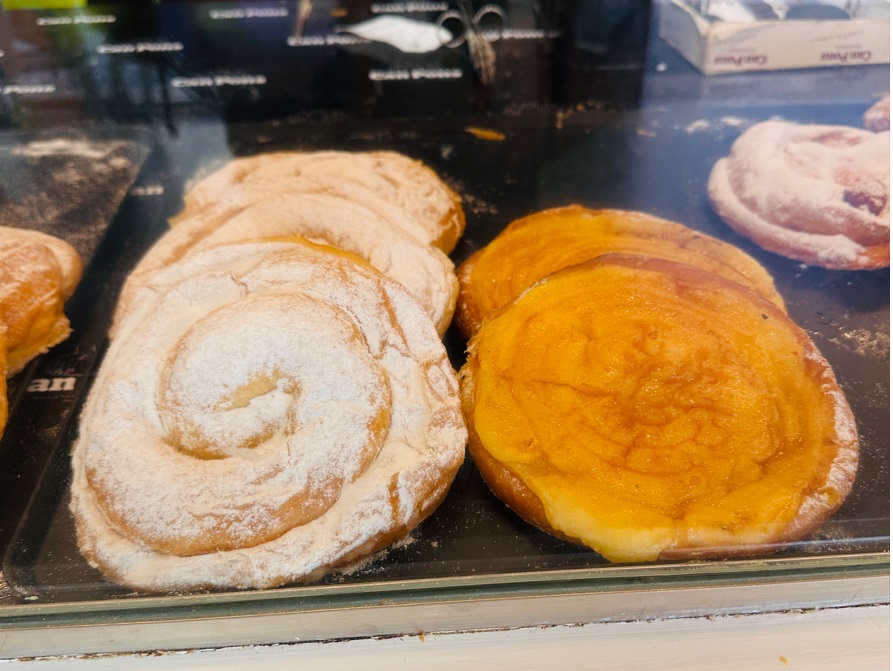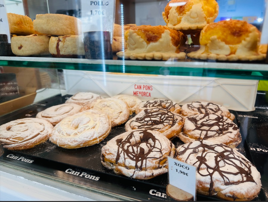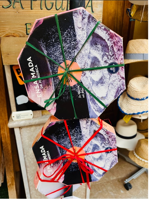 La ensaimada, se hace en Mallorca y en Menorca. La ensaimada de Mallorca (del mallorquín ensaïmada) es un alimento de masa azucarada, fermentada y horneada, elaborada con harina de fuerza, agua, azúcar, huevos, masa madre y manteca de cerdo (en mallorquín saïm, de ahí el nombre). Es un producto de repostería de gran tradición en la isla, ya que desde muy antiguo y de forma continuada se elabora y consume en Mallorca.