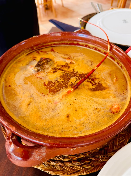 Caldereta de langosta: hasta hace poco este tipo de salsa o sopa de pan era un plato pobre de pescadores, ya que las langostas menorquinas eran fáciles de encontrar. Sobre un fondo de cebolla, tomate, ajo y perejil se añade la langosta troceada y se cuece a fuego vivo. La caldereta es el plato menorquín más conocido internacionalmente y, de todas las calderas menorquinas, la más emblemática es la de langosta. Otras calderetas que se hacen mucho son a base de pescado, a menudo de roca, como la caldereta de mero.