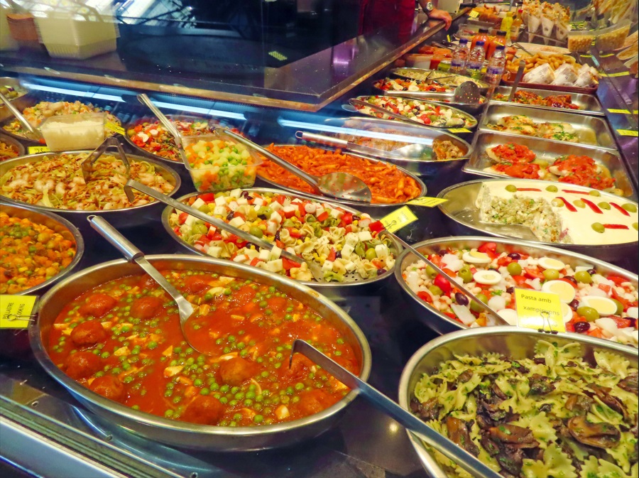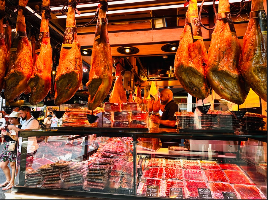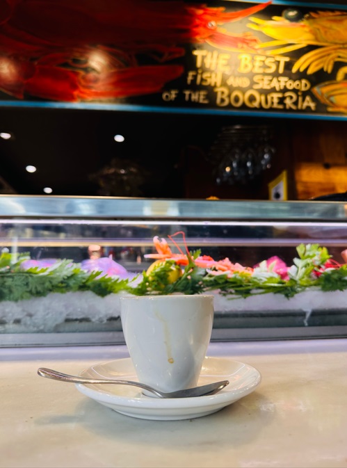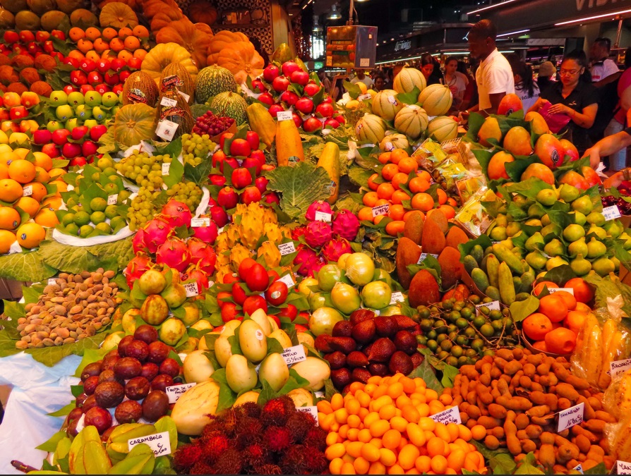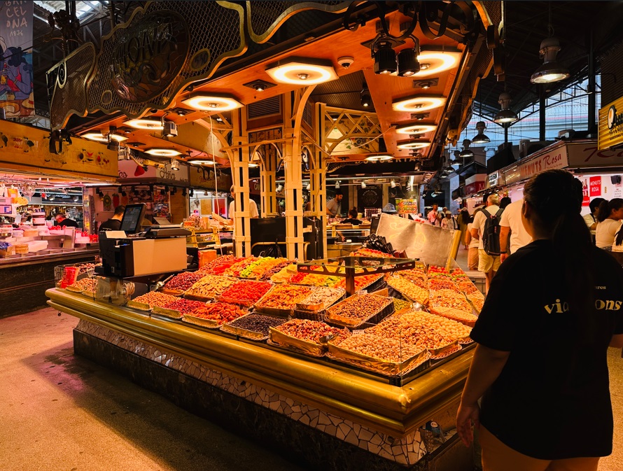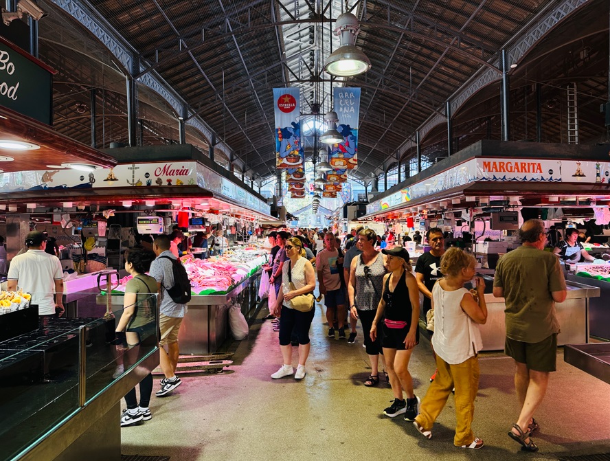 Mercado de La Boquería, otra parada obligada. Este mercado es la madre de todos los mercados barceloneses. Aunque precisamente esa condición de punto turístico le hace perder parte de su encanto. Este hecho también ha influido en el cambio que han dado los puestos de este mercado. Ya no solo es un sitio para hacer compras de productos frescos si no que cada vez hay más puestos pensados para los turistas. Aquí puedes comprar desde cucuruchos de tacos de jamón y fruta cortada hasta bombones y turrones.