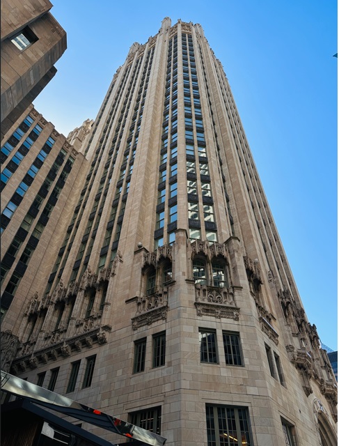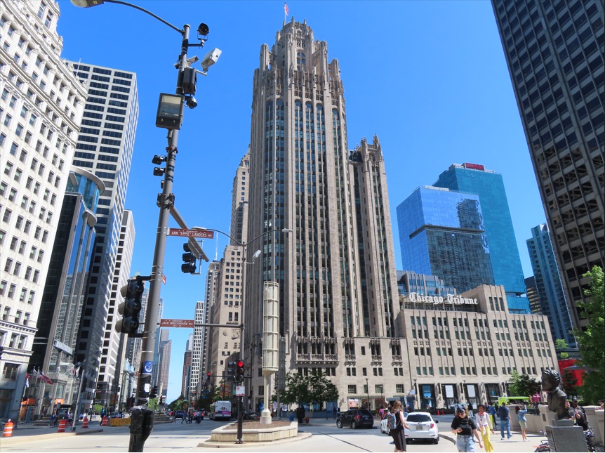 Tribune Tower, un rascacielos de estilo neogótico con un espectacular arco de entrada. Fue terminada en 1925, llama la atención por su torre octagonal y por el arco de entrada, alto como tres pisos y con representaciones de las fábulas de Esopo. Se creó para conmemorar el 75 aniversario del periódico Chicago Tribune y, a modo de curiosidad, en sus paredes tiene incrustadas piedras de célebres monumentos de todo el mundo, como la Gran Muralla China, el Taj Mahal o la Gran Pirámide.