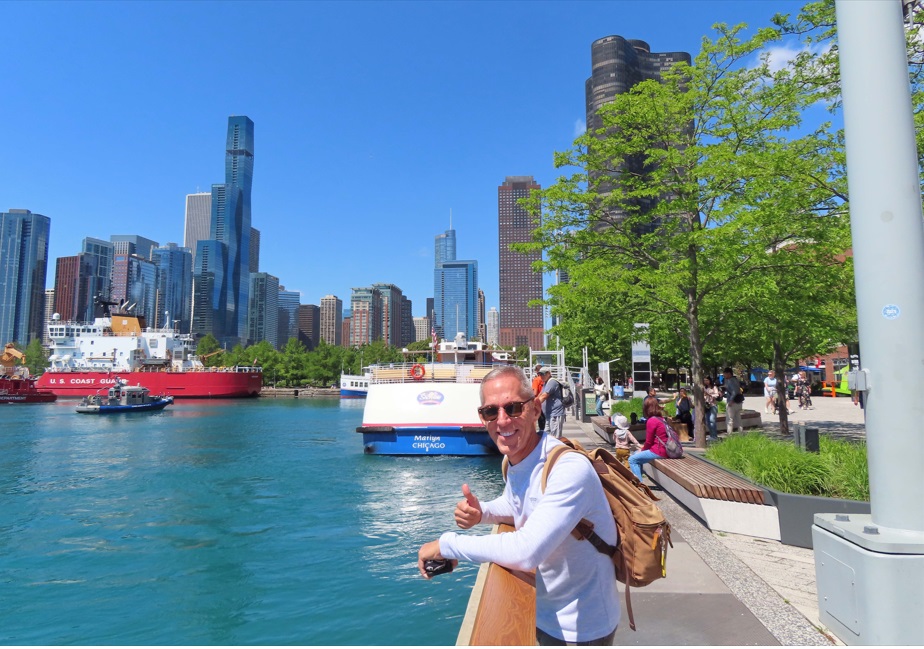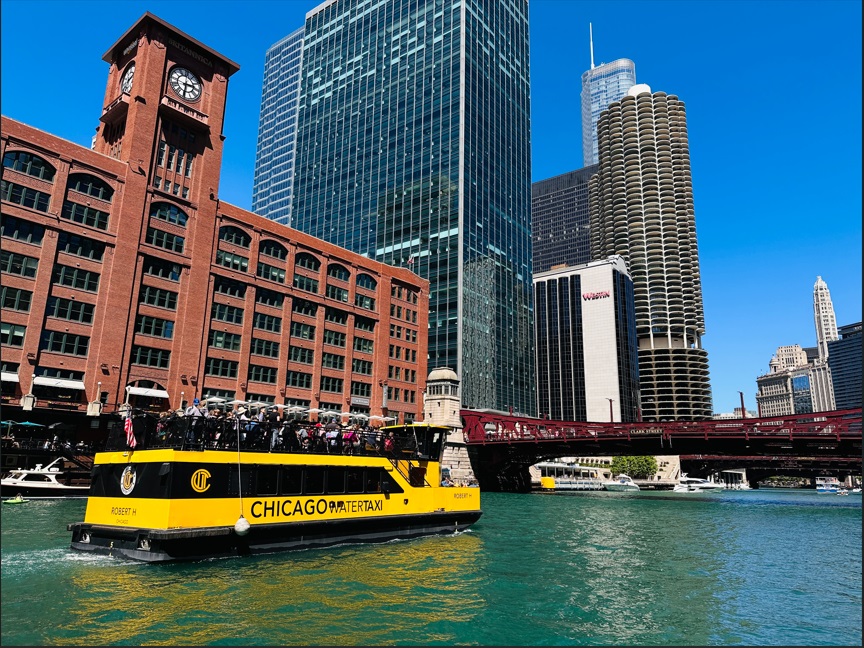 Chicago Water Taxi de Michigan Avenue. Mi idea es aprovechar para ver el espacio llamado The Riverwalk. Se trata de un agradable paseo peatonal que recorre parte de la orilla del río Chicago y está repleto de espacios donde sentarse, restaurantes, bares y terrazas cerca del agua. Disfruta de las vistas arquitectónicas y súbete en un crucero o taxi acuático. Podemos bajarnos en Chinatown, vemos por allí un rato y regresamos.