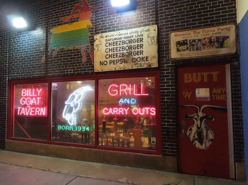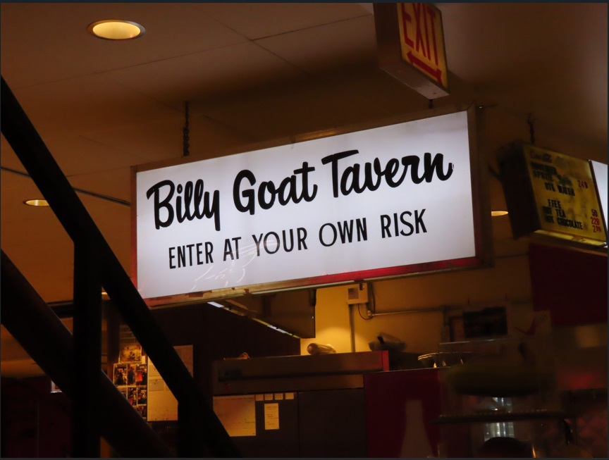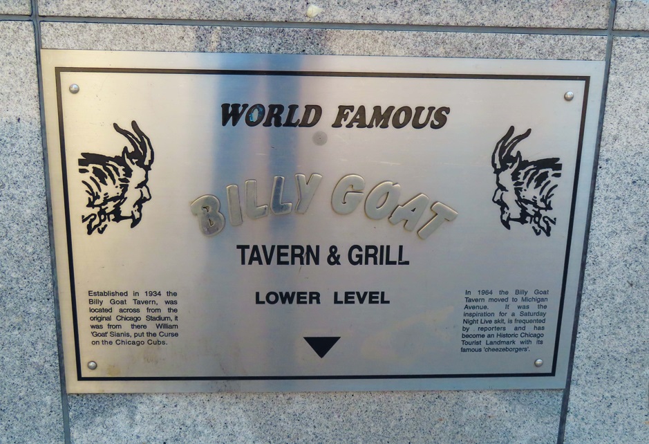 Billy Goat Tavern. Todo comenzó en 1934 cuando Billy "Goat" Sianis fundó su taberna, un inmigrante griego. Inmediatamente se convirtió en el hogar favorito de los periodistas de Chicago, quienes ayudaron a que la leyenda siguiera creciendo. Desde la infame maldición de los Cachorros hasta el clásico sketch de SNL.