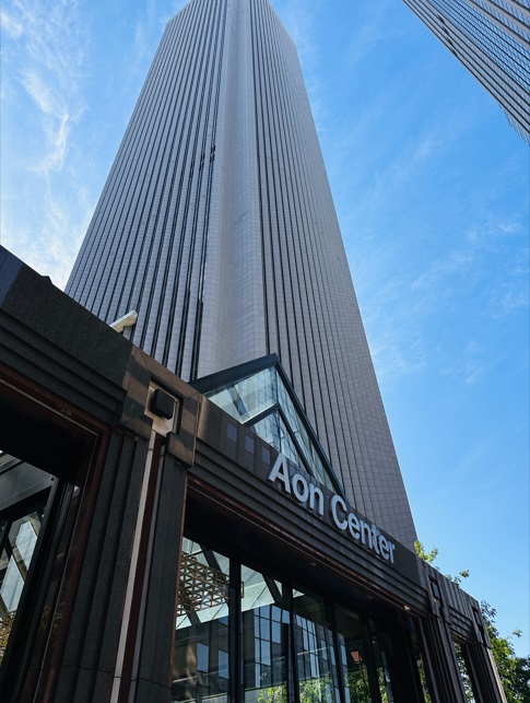Aon Tower en la zona del Loop es el tercer rascacielos más alto de Chicago. Este edificio de 346 metros es la sede oficial de la empresa Amoco desde 1972, momento en que se terminó su construcción. A modo de curiosidad, el blanco inmaculado de la fachada se debía a que estaba todo recubierto de mármol; pero a partir de 1990, tuvieron que cambiarlo todo por granito, también blanco, ya que las placas de mármol se caían. Si no se contaran ni antenas ni decoraciones a la hora de tomar las medidas de los rascacielos, el Aon Tower sería el edificio más alto del mundo.