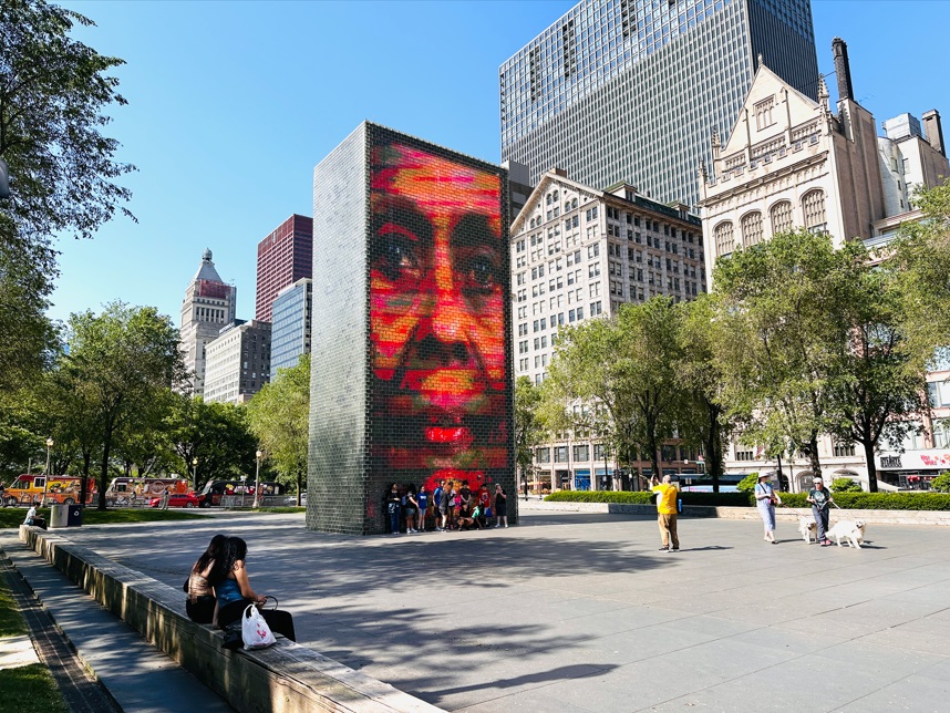La Fuente Crown. Nunca había visto una fuente como esta. Diseñada por el artista barcelonés Jaume Plensa, es una de las numerosas formas de arte público que se exhiben en las calles de Chicago. Consiste en dos torres que contienen pantallas led y tienen la particularidad de proyectar imágenes. Así que, si visitas la Crown Fountain, verás que los rostros proyectados que "escupen" el agua van variando para mostrar (y homenajear) distintos ciudadanos de la ciudad, de hecho pertenecen a una muestra representativa de 1.000 residentes de Chicago. Como curiosidad, la inspiración de esta obra viene de las tradicionales gárgolas expulsoras de agua.
