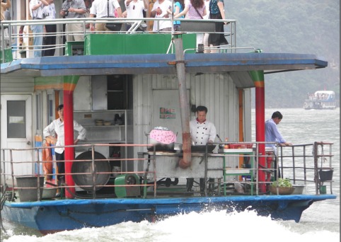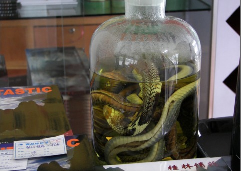 El plato exótico que ofrecen en el barco es el vino de culebra. En un frasco en medio líquido se observa enroscado y desde luego, muerto al animal. |