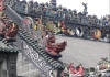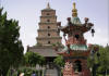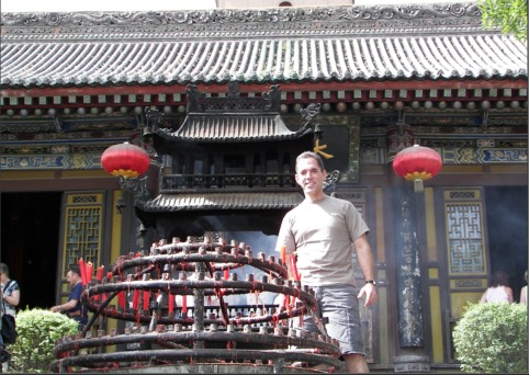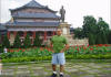 La ciudad llena de contrastes. Templo de la Familia Chen, creado como una escuela de doctrina confuciana y lugar de culto por los Chen, entre 1840 y 1846. Templo de la Familia Chen, consta de tres estancias principales y un enorme conjunto de salas y pabellones donde encontraremos preciosos frisos. Los muebles antiguos le dan ese aire tan especial. Te puedes encontrar sorpresas en sus pasillos. Es una obra representativa de la arquitectura tradicional. Cada detalle, conserva sus colores y son hechos en madera. Monumento a Sun Yatsen, fue erguido en honor del fundador de la República, tiene una estructura octagonal y las tejas que lo cubren son de color azul. Gabriel posando en el Monumento a Sun Yatsen.