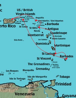 Viajar en grupo y especialmente en crucero requiere de algo de planificación y mucha coordinación. El primer paso fue seleccionar un líder del grupo, en ese caso fui yo, como parte de mis labores me contacté con la agencia y le indiqué que se viajará como grupo al hacer las reservas en la Agencia de viajes. El viaje se separó con mucho tiempo de anticipación, lo que nos aseguró un buen precio. Se seleccionaron tres camarotes dobles para estar más cómodos, lamentablemente Travel Planner no nos permitió seleccionar los mismos para estar cerca, pero unos estábamos en el piso 6 y otros en el 7. Para la cena nos tocó el segundo turno, lo que nos permitió aprovechar hasta el último minuto en las escalas. como grupo unos decidimos ir un par de veces al comedor formal y otros por la libre, el ponerse de acuerdo como grupo nos aseguró que pudiéramos disfrutar mucho mejor. La ruta fue Charlotte Amalie, St. Thomas como primer puerto, luego altamar, así siguieron Bridgetown, Barbados; Castries, St. Lucia; Basseterre, St. Kitts y Philpsburg, St. Martín (ver mapa a la derecha). |