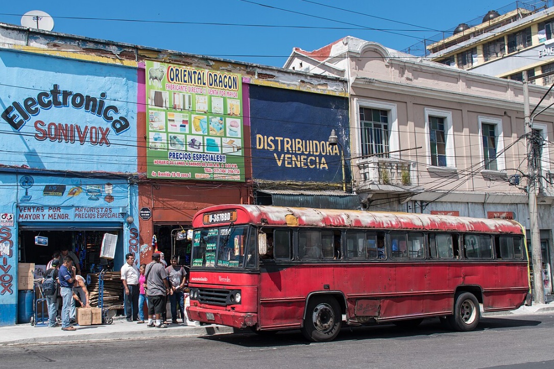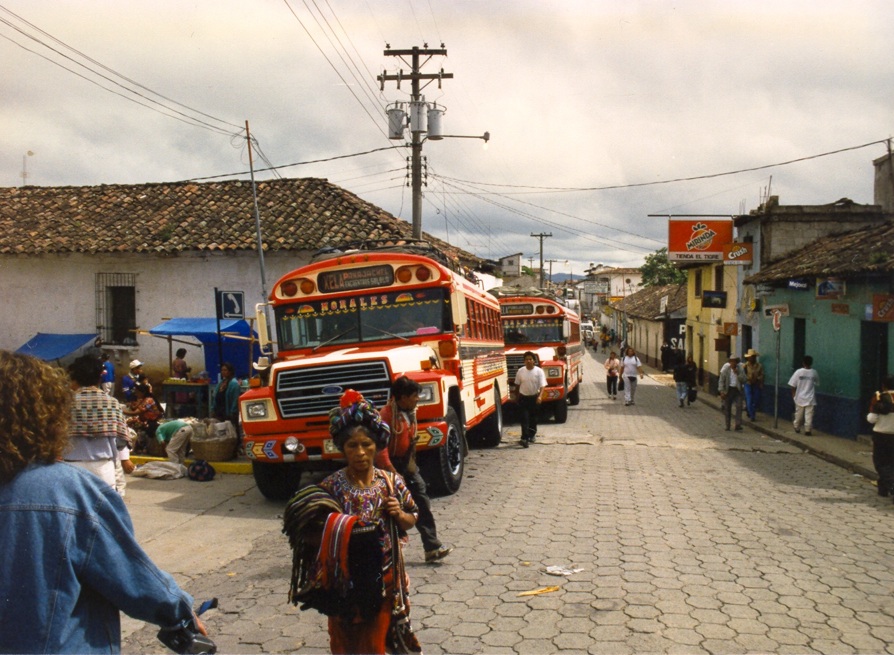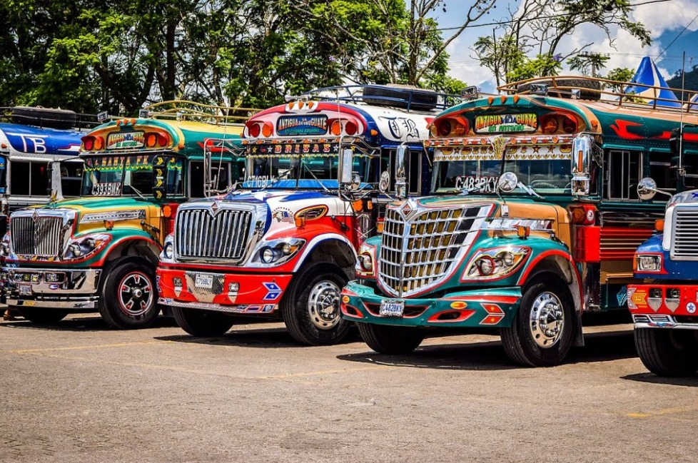 Los ómnibus guatemaltecos son muy coloridos. Son conocidos como "burras" o "chicken buses", camionetas coloridas que utilizan los visitantes para moverse por el país. Estas camionetas, que son en su mayoría escolares retirados de Estados Unidos, se personalizan con colores y letras, y son un atractivo para los visitantes. Se utilizan principalmente para viajes cortos y pueden transportar mercancías, aunque son estrechas e incómodas para personas altas. Los rojos, se ven en muy mal estado y los usan los residentes para trasportarse.