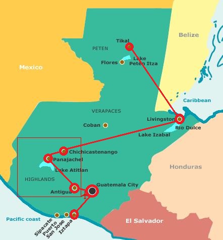 Al que nunca ha ido anteriormente, como nosotros, le recomiendan cuatro localidades por donde empezar a explorar Guatemala, Ciudad de Guatemala, Chichicastenango, Lago Atitlán y Tikal. Nosotros añadimos otras el viaje nos llevó también a la ciudad de Panajachel, Santa Catarina, y Antigua Guatemala entre otras. La aventura sale al paso del visitante en cada momento, y escoger se hace difícil debido al limitado número de opciones en mano del viajero.