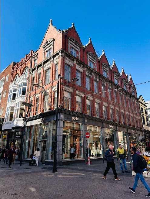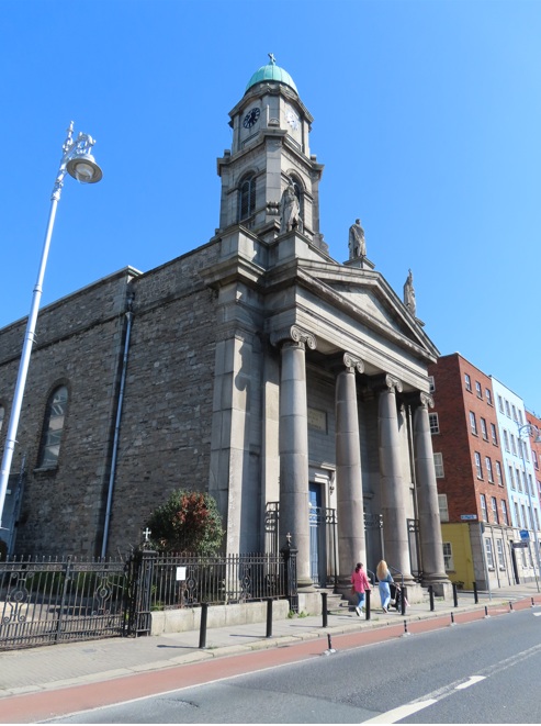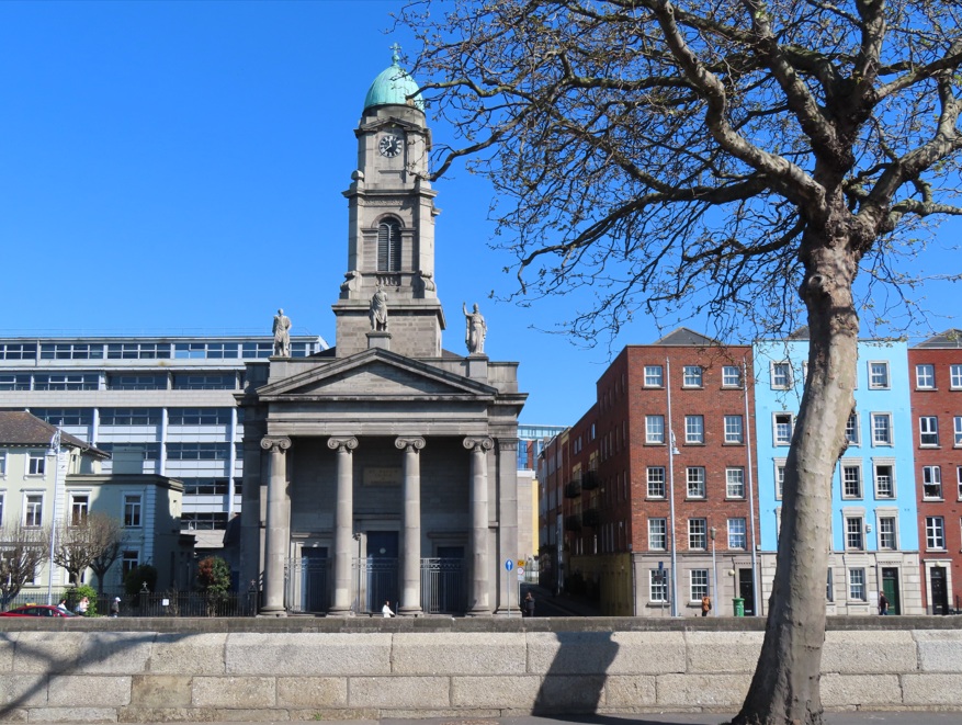Dejando a los lados los típicos edificios de ladrillo rojo que predominan en Dublín, nos vamos acercando al corazón de la ciudad encontrándonos primero con una iglesia muy estrecha, St. Paul’s Church, Silchester Road Dublin A96 T9c7 Dublin. La iglesia fue construida entre 1835 y 1837 según el diseño de Patrick Byrne. La fachada tiene un pórtico de granito con cuatro columnas jónicas. El campanario de tres niveles de estilo italiano, con su cúpula de cobre, se completó en 1843 y es un punto focal visual a lo largo del muelle. La inclusión de un reloj, menos común en las iglesias católicas, implica un sentido de responsabilidad pública, lo que aumenta el estatus del edificio.