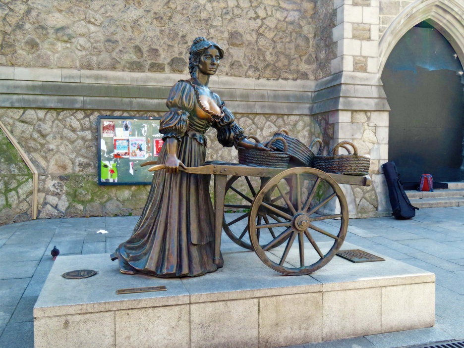 Ayuntamiento y Castillo de Dublín. Terminada la visita al Trinity College puedes pasear por la calle Suffolk hasta encontrar la estatua de bronce de Molly Malone, uno de los símbolos de Dublín. Esta estatua hace referencia a la canción popular, convertida en el himno no oficial de Dublín, «cockles and mussels», que trata sobre una vendedora de pescado ambulante que ejercía la prostitución durante la noche.