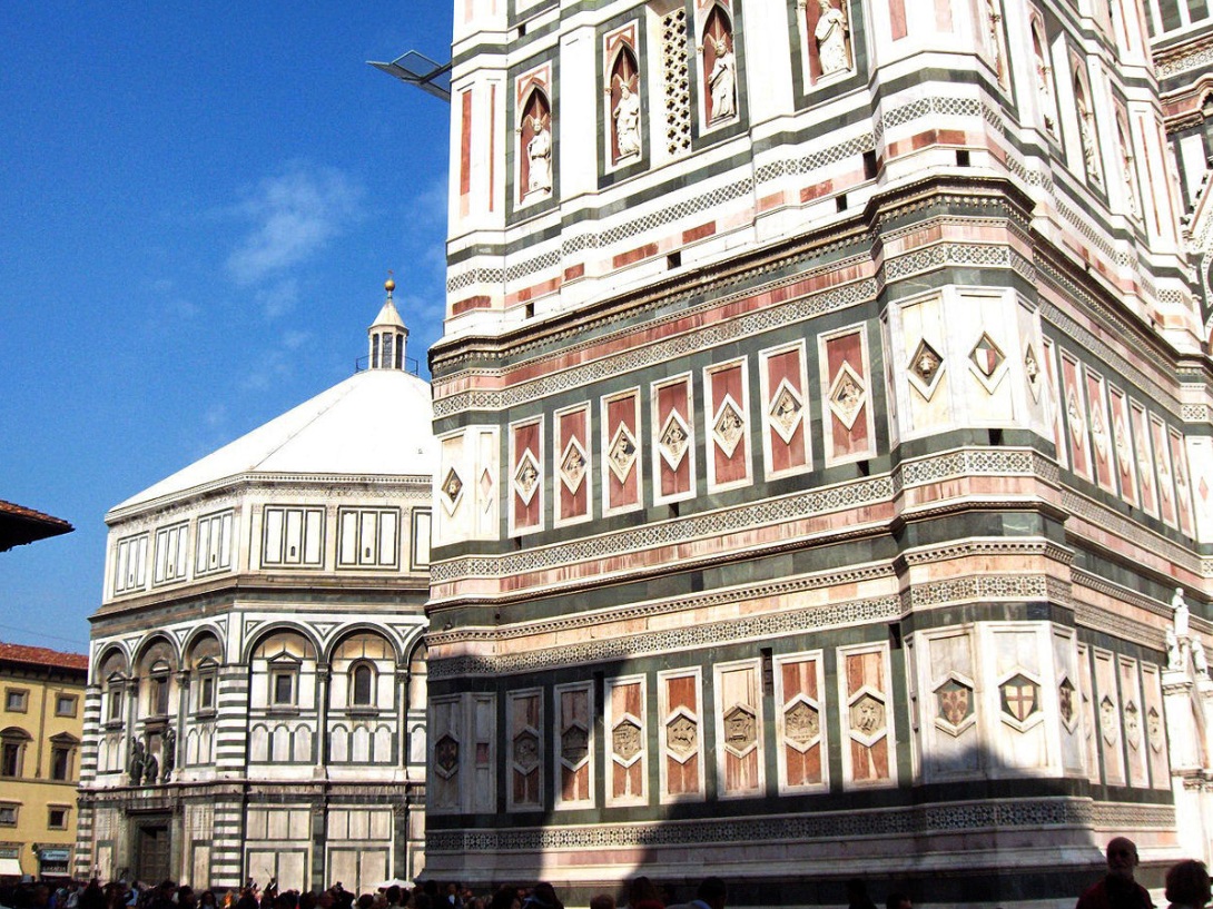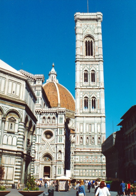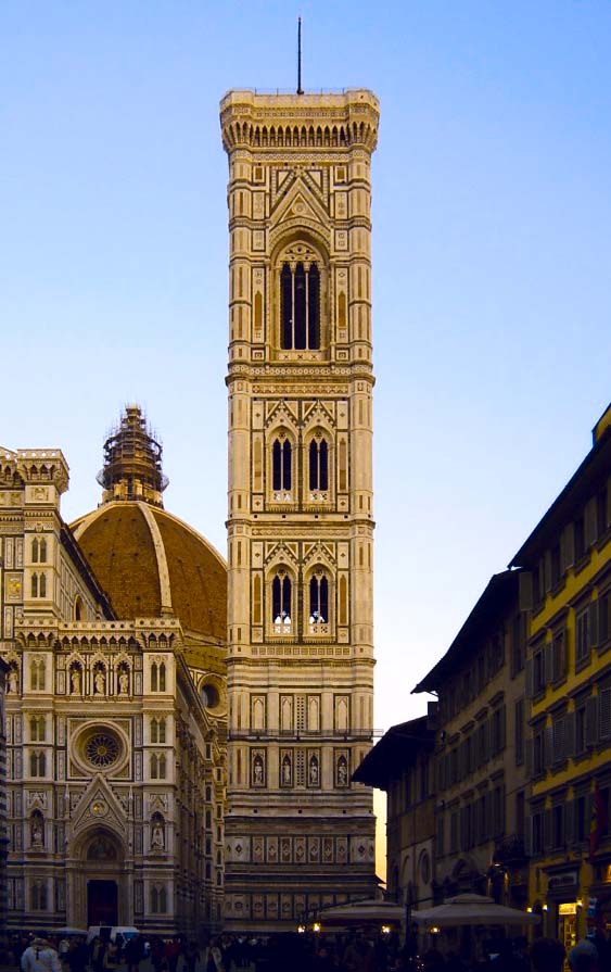 El campanario está separado a unos pocos metros y se puede acceder hasta la cima solo por escaleras, son unos cien metros, todo un desafío que se logra tomando respiro en los niveles con descanso. El Campanile de Giotto es la torre campanario de la iglesia Santa María del Fiore, catedral de Florencia, situada en la plaza del Duomo. Es un ejemplo típico de los campaniles italianos, edificios separados de la iglesia destinados exclusivamente a disponer en ellos los campanarios y evitar los daños por vibraciones en el edificio de la iglesia.