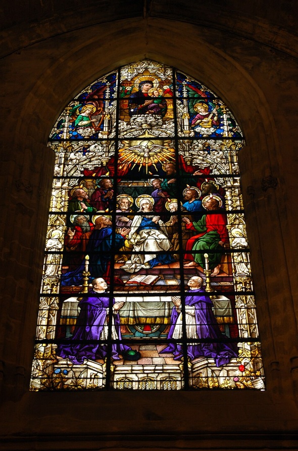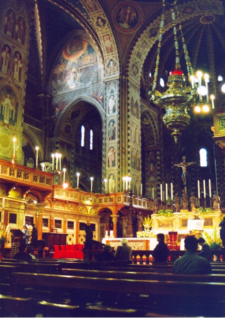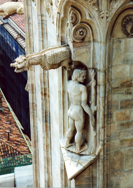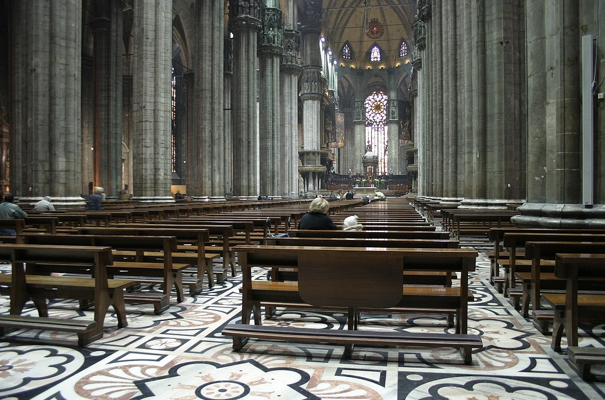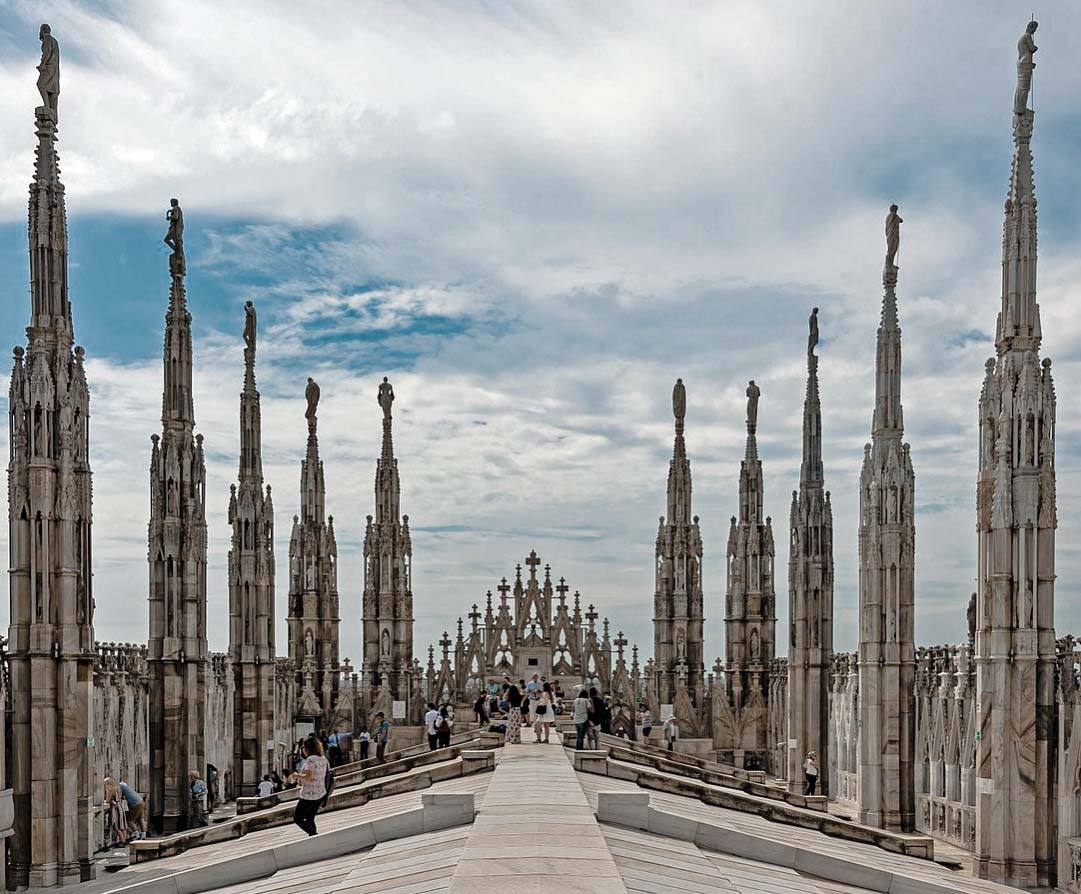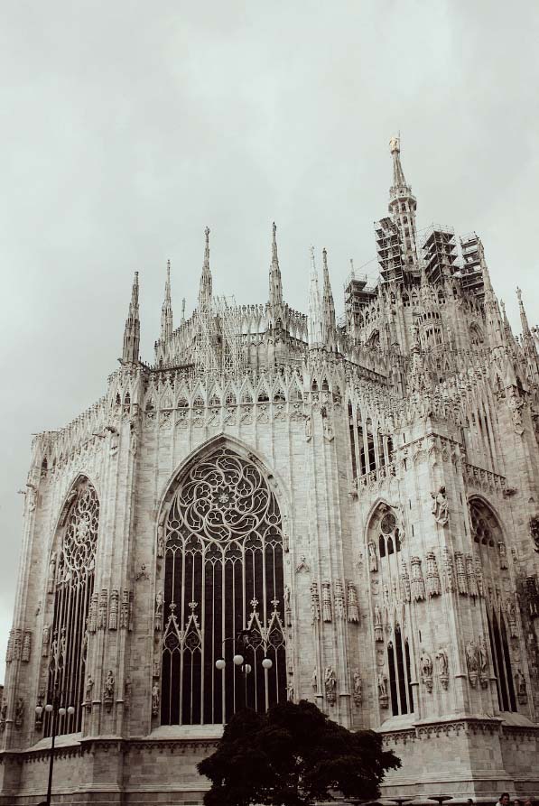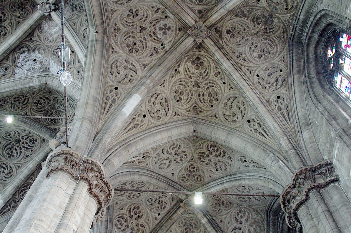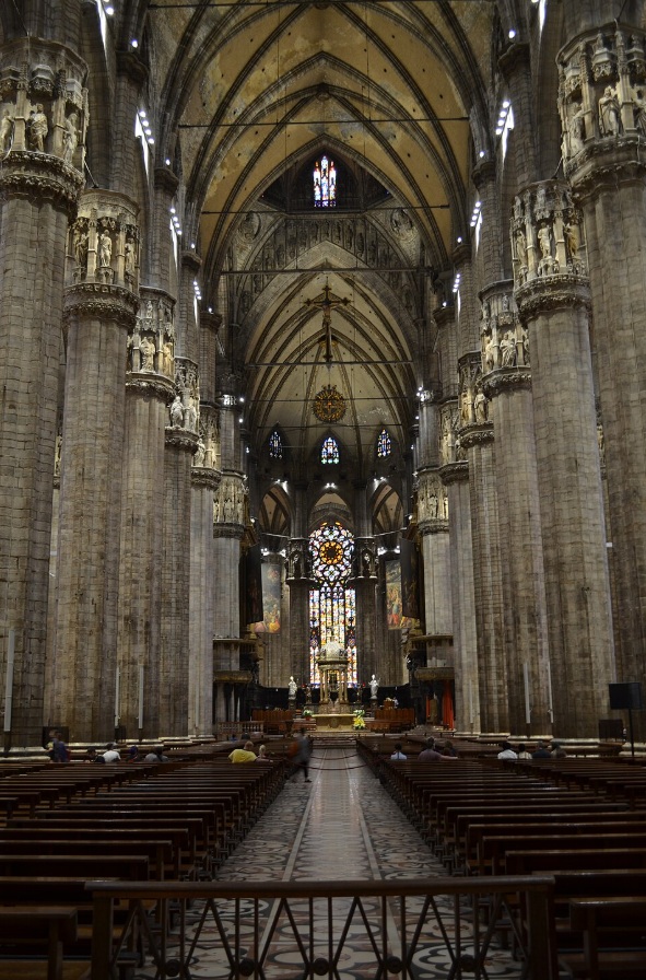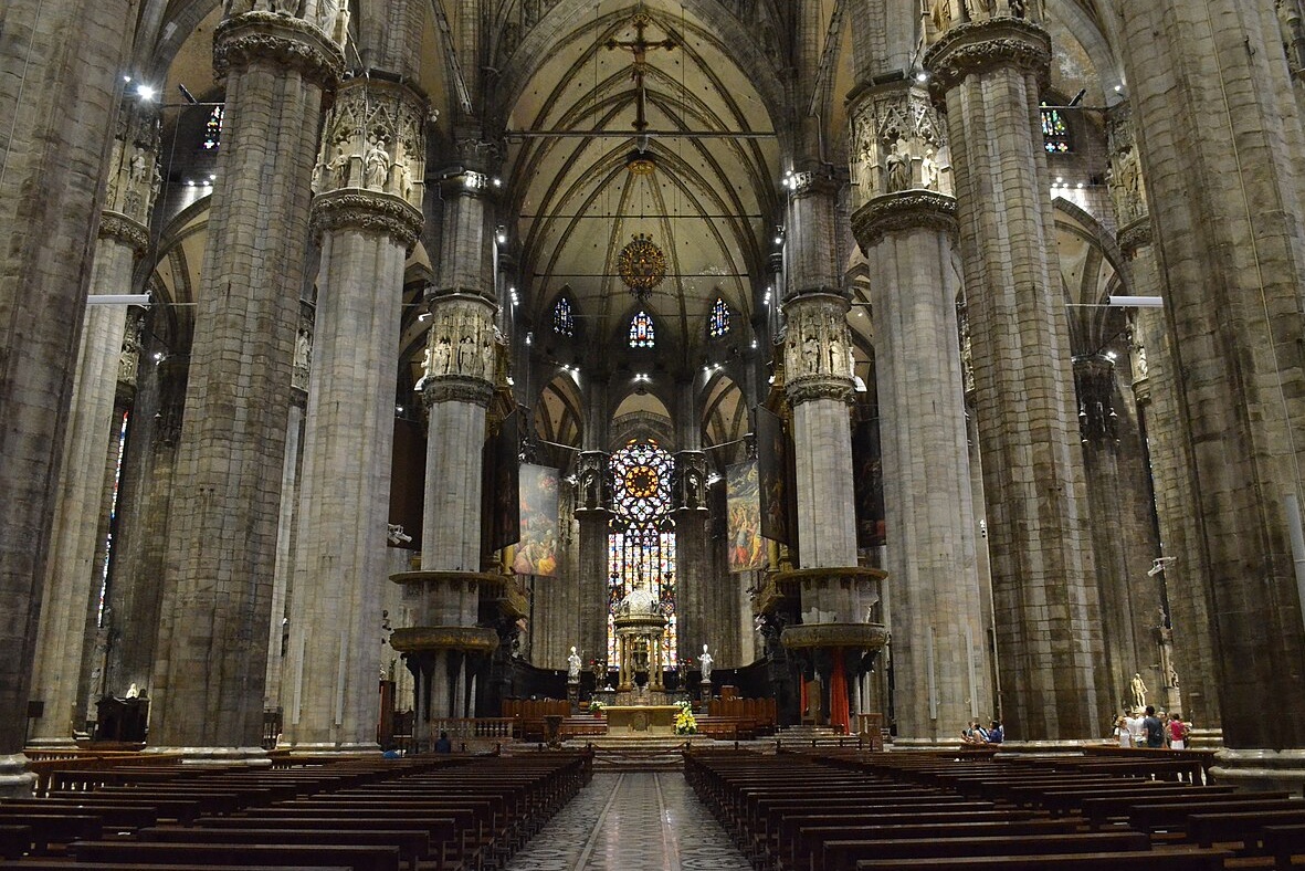 La catedral de Milán es un templo de grandes dimensiones, de cinco naves, una central y cuatro naves laterales, con al menos cuarenta pilares, atravesada por un transepto seguido por el coro y el ábside. El interior es sombrío dado por sus ventanales pequeños, salvo por el deambulatorio. El gótico en los países latinos, achica los huecos y aumenta los macizos. Los pilares están interrumpidos en el arranque de las bóvedas por una decoración de capiteles esculpidos.