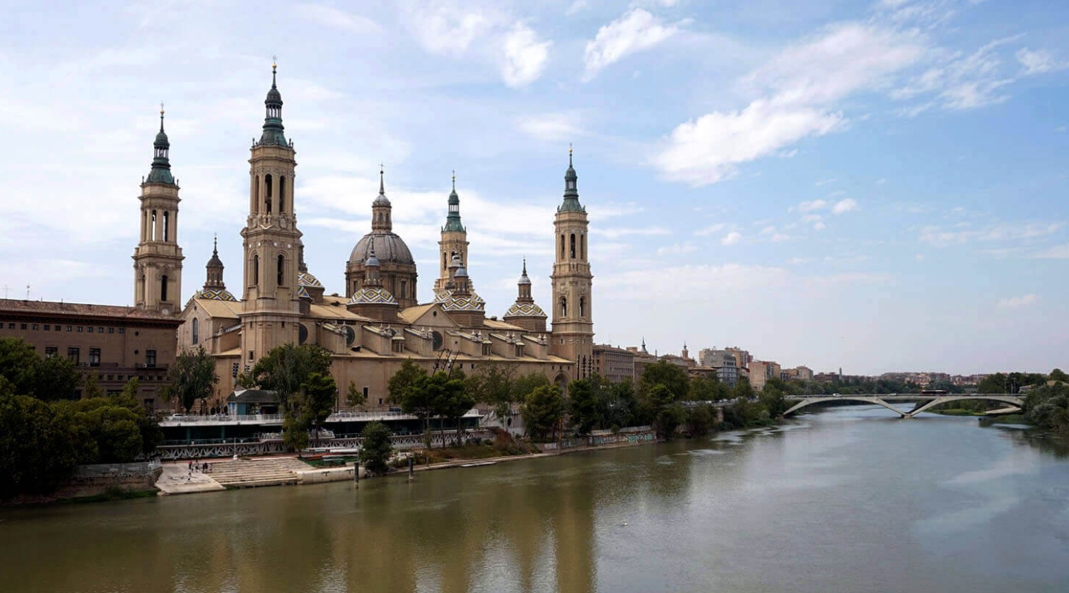 Su tierra está bañada por el Ebro, el río más caudaloso de España, que cruza y embellece la misma capital. La Basílica de Nuestra Señora del Pilar, es uno de los santuarios más celebres del mundo y lugar de peregrinaciones durante siglos. Y es que la virgen del Pilar no es sólo la patrona de Zaragoza sino de todos los países de habla hispana. Así el día del Pilar,12 de Octubre, es día nacional de la hispanidad. De ahí la importancia simbólica de este templo. El templo actual es un edificio barroco que comenzó a construirse en el año 1681. Está flanqueado por cuatro esbeltas torres y su fachada principal es neoclásica.