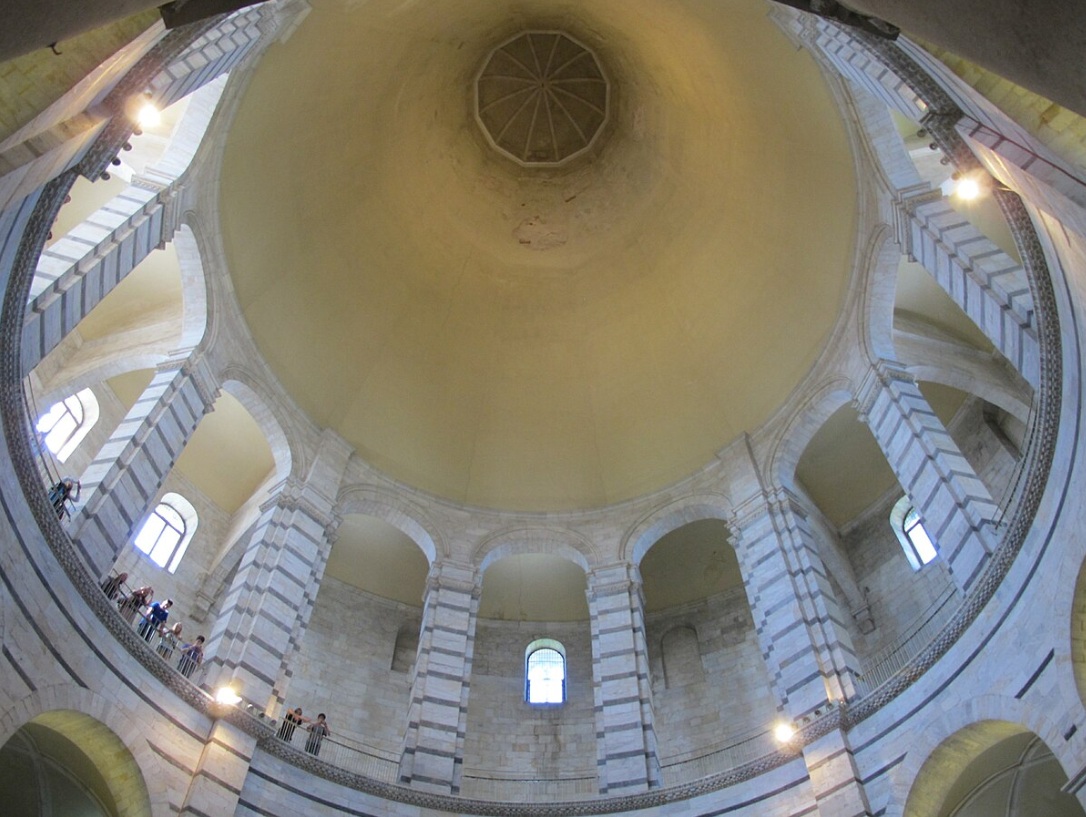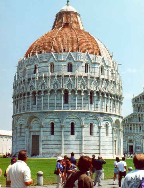 El Baptisterio, una construcción circular, cuyo sencillo interior contrasta con el exterior sumamente trabajado. El Baptisterio de Pisa, dedicado a San Juan el Bautista, está frente a la catedral en el extremo occidental de la Piazza dei Miracoli. Comenzó a construirse en el año 1152, y fue concluido en el 1363. Es el ejemplo de baptisterio independiente más reconocido del mundo. En 1987, el conjunto patrimonial de la plaza fue declarado Patrimonio de la Humanidad por la UNESCO.