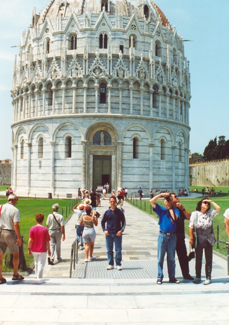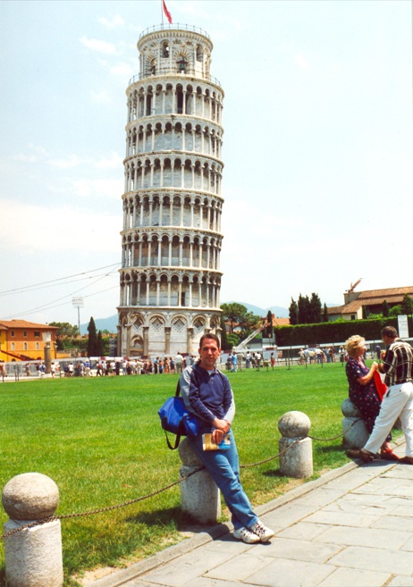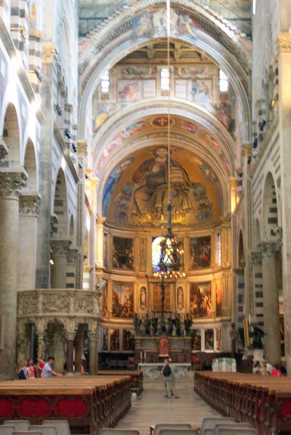 Que decir de la Torre de Pisa, que no se haya dicho ya. Fue proyectada como el campanario de la Catedral, ha resistido a los bombardeos de la segunda guerra mundial, ha sufrido varios intentos de "enderezamiento", pero ahí sigue, desafiante, resplandeciente sobre un manto de césped verde. Todos los turistas nos hacemos la misma foto. Jugando con las distancias y simulando empujarla, yo para variar, me la hice sentado con la torre detrás. La catedral de Pisa, el Duomo es uno de los edificios más hermosos de todo el romántico italiano. Su interior está decorado con una delicadeza, rayando entre la majestuosidad y la sencillez. Es quizás, una de las mejores catedrales que he visto en mi vida.
