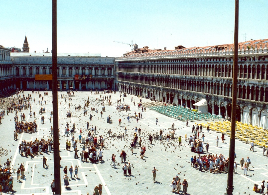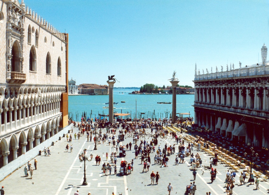 La plaza de San Marcos, se inició en el siglo IX como un área pequeña frente a la original basílica de San Marcos, construcción anterior a la actual, dedicada en sus inicios a San Teodoro, primer patrón de Venecia. Es por este hecho que encontramos a San Marcos y San Teodoro en las columnas situadas en la Piazzetta junto al Gran Canal.
