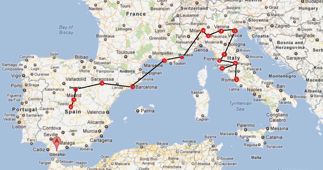 En este viaje se visitaría Madrid, Toledo, Segovia, Barcelona, Niza, Milán, Venecia, Padua, Florencia, Roma y Pisa`. Como se imaginarán, era una gran proeza hacerlo en 16 días, pero con una buena planificación, se pudo hacer. Claro, no fueron suficientes, siempre va a quedar un motivo para querer regresar, siempre será necesario volver a visitar un paisaje, probar una comida o admirar una escultura que no pudimos ver en nuestro viaje anterior.
