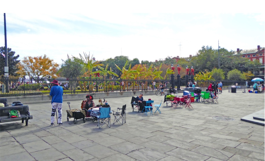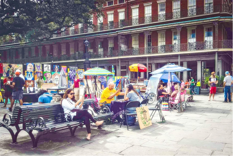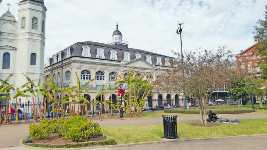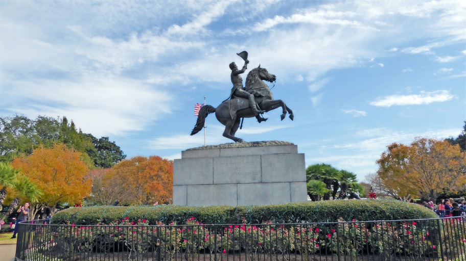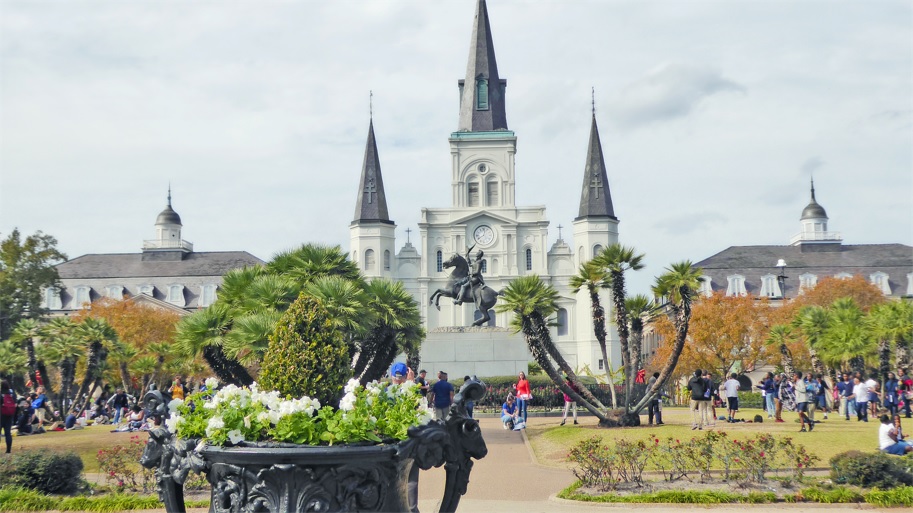 El primer día arrancamos temprano y nos fuimos para la zona del French Quarter. Por esa misma calle caminamos hasta el símbolo de la ciudad, Jackson Square, antiguamente llamada «Plaza de Armas». En la plaza hay una gran estatua de Andrew Jackson, mucho verde, bancos para sentarse a tomar un descanso o para apreciar la vista, y una fuente donde la gente suele tirar monedas y pedir deseos, yo tiré algo, por si acaso.