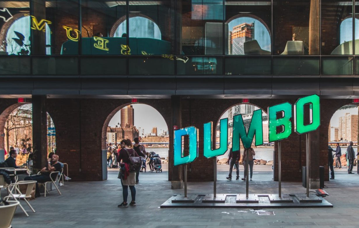 Dumbo se encuentra en Brooklyn, a orillas del East River y entre los puentes de Brooklyn y de Manhattan. Por el este, se extiende unas calles más allá del puente de Manhattan hasta mezclarse con Vinegar Hill, el barrio vecino. El nombre delata su ubicación: Dumbo es un acrónimo de las palabras Down Under the Manhattan Bridge Overpass. Es decir, significa ‘Debajo del puente de Manhattan’
