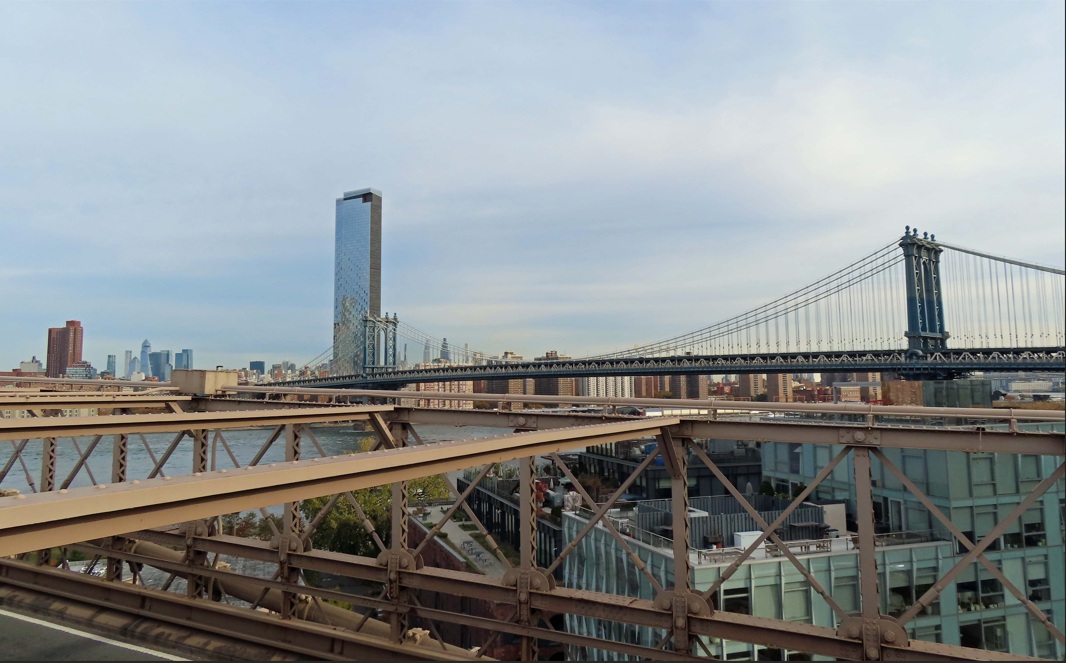 Manhattan Bridge. Caminando son 34 minutos desde el Williamsburg Bridge. Con su contraste entre piedra y metal, los puentes de Brooklyn y de Manhattan son una de las parejas más fotogénicas de Nueva York. Arriba me esperan muy pocos viajeros y unas vistas espléndidas del skyline y del East River. El puente de Manhattan se inauguró en 1909 y fue el último de los tres en construirse.