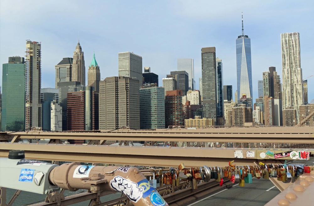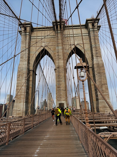 Manhattan Bridge es muy poco turístico y lo usan, sobre todo, los neoyorquinos. El gran inconveniente de este puente es que los metros circulan a todas horas y, cada minuto aproximadamente, un traqueteo rompe la tranquilidad y hace que incluso el suelo bajo tus pies vibre con el estruendo. ¡Nadie es perfecto! Recorrerlo sin paradas, unos 30 minutos. Pero, teniendo en cuenta que pararé a sacar alguna foto o vídeo, le voy a reservar como mínimo 45 minutos. En cuanto subas a la pasarela, te darás cuenta de que este puente, como el de Williamsburg, tiene un inconveniente: está rodeado de una valla metálica (para prevenir suicidios) que te obligará a hacer malabarismos para sacar buenas fotos.