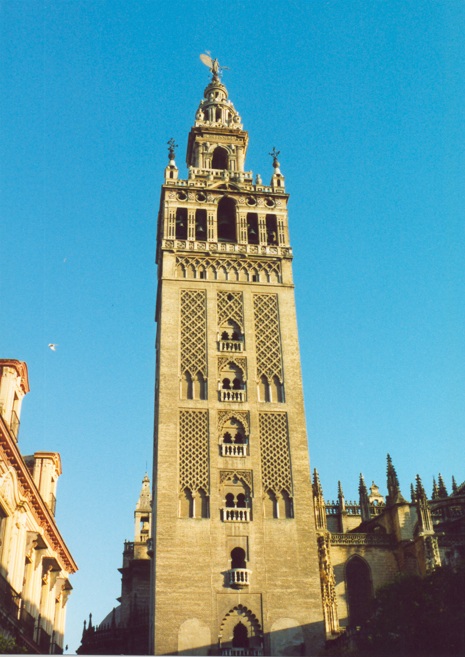 La Giralda es la torre campanario de la catedral de Santa María de la Sede de la ciudad de Sevilla, en Andalucía (España). La parte inferior de la torre corresponde al alminar de la antigua mezquita de la ciudad, de finales del siglo XII, levantado en época almohade, mientras que la parte superior es una construcción sobrepuesta en el siglo XVI, en época cristiana, para albergar el cuerpo de campanas.