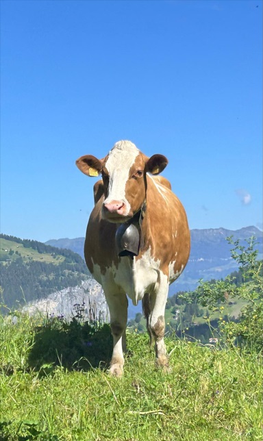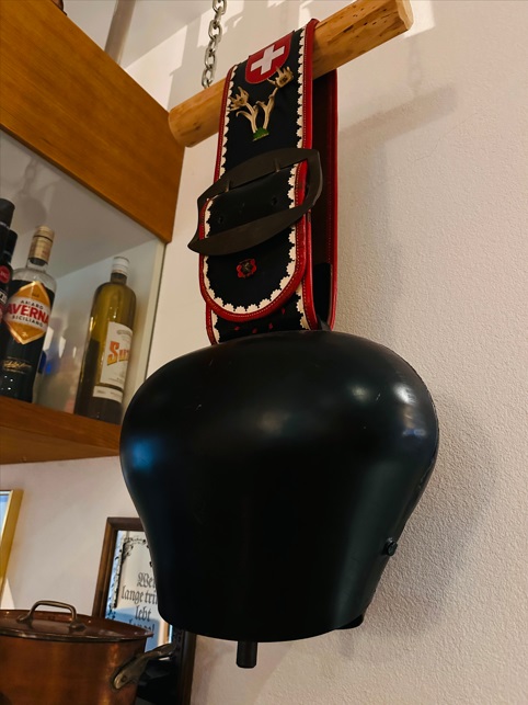 Durante el trayecto vimos a las vacas con su campana colgando en el cuello. La tradición tiene 2 motivos: tranquilizar a los ejemplares y el poder ubicarlos en los potreros. A los animales en su edad de pubertad se les acomoda un collar que tiene un campana que con cualquier movimiento del animal o el viento suena. A mi me pareció triste, pero que viva la tradición, dicen los suizos.