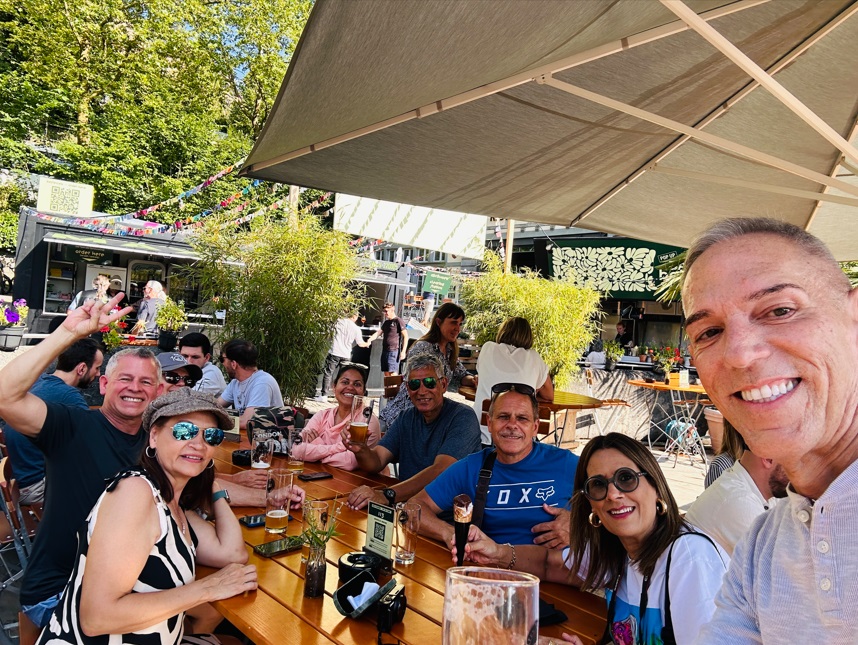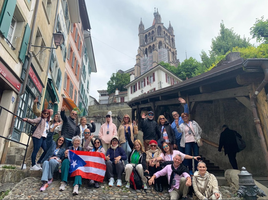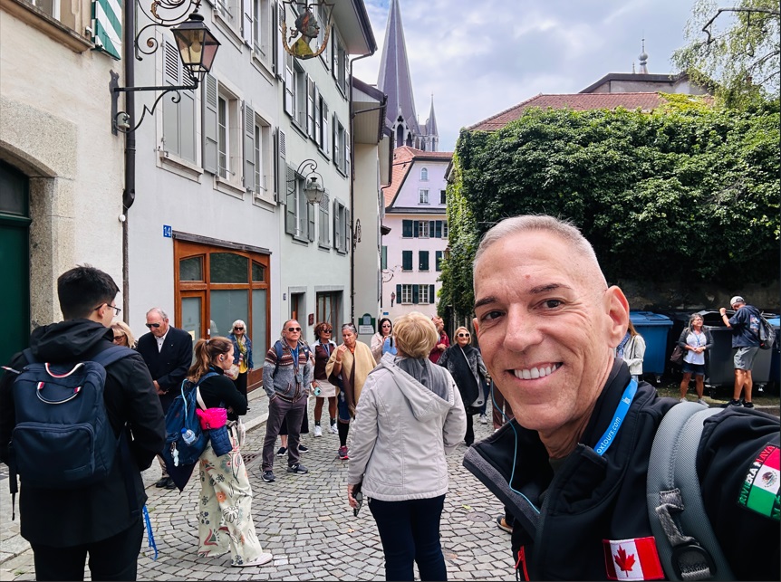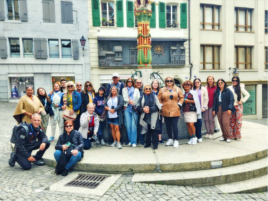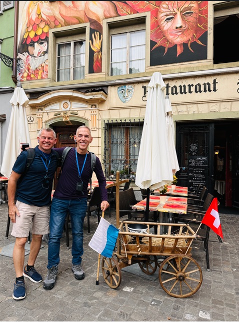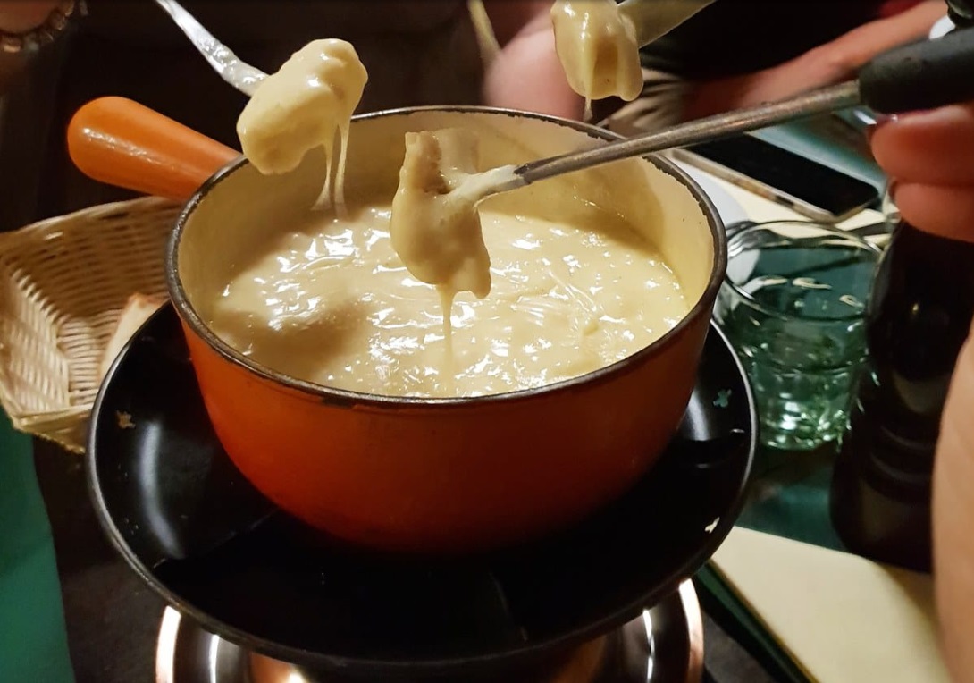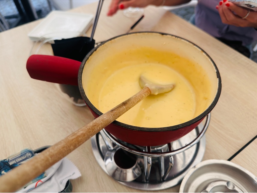 Siempre se aprovecha el tiempo para compartir. El grupo era de 49 dividido en dos guías locales. De la comida local probé varias cosas. El cantón tiene una notable producción de embutidos. Cabe destacar la salchicha Vaudois, de puro cerdo. La tomme vaudoise es la única masa blanda con corteza hinchada típica de la Suiza francesa, se trata de un queso blando y se sirve con embutidos. Fondue. No se puede visitar Lausana sin participar en el arte de la fondue. Nunca había probado la auténtica fondue suiza antes de visitar Lausana, ¡y no me decepcionó! El vino es la verdadera estrella del cantón de Vaud. La principal variedad de uva en los viñedos de Lavaux es la Chasselas, que se adapta bien al suelo y al clima para producir vinos secos, afrutado y robustos.