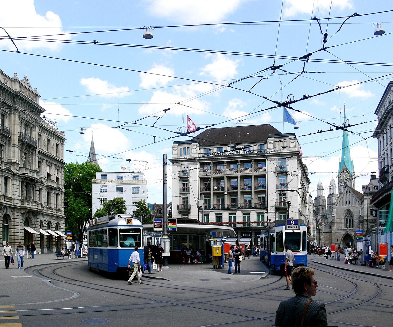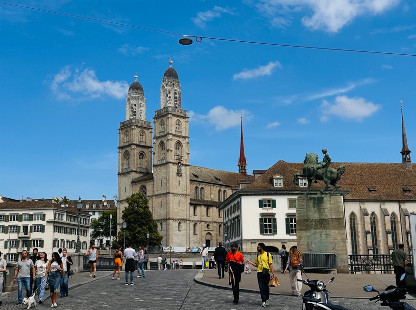 Muy cerquita del barrio Niederdorf, encontramos la principal iglesia de Zurich: Grossmünster. Los orígenes de este edificio se remontan al año 1100. Desde entonces, ha sido renovada y reformada en distintas ocasiones. La iglesia es de estilo románico con elementos góticos y destaca especialmente por sus dos campanarios gemelos, las que fueron construidas entre 1487 y 1492. En esta plaza se encuentra la Ópera de Zurich, la que ocupa un edificio de estilo neoclásico.