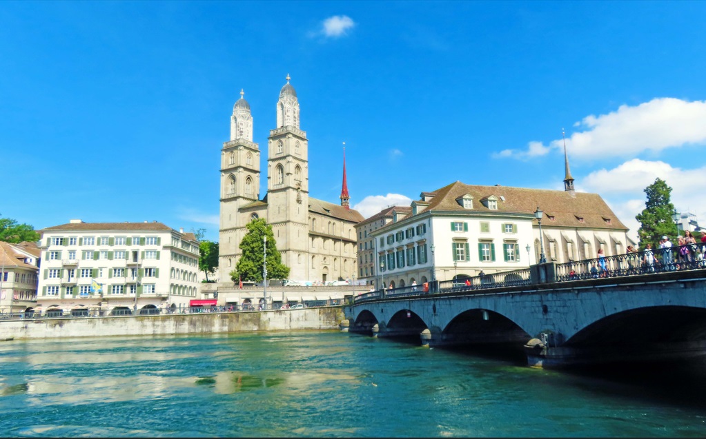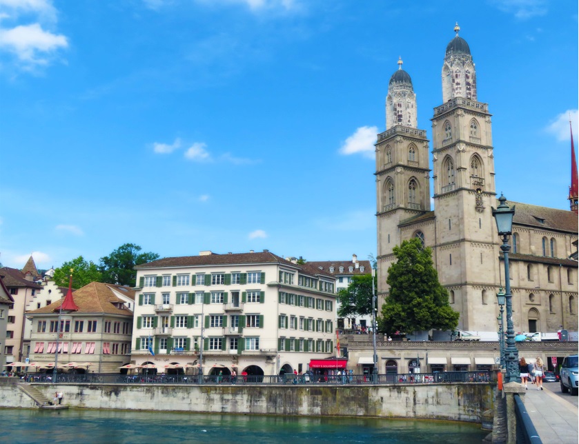 La Grossmünster (izquierda) y la Fraumünster (derecha), a orillas del río Limago y junto al Puente de Munster.