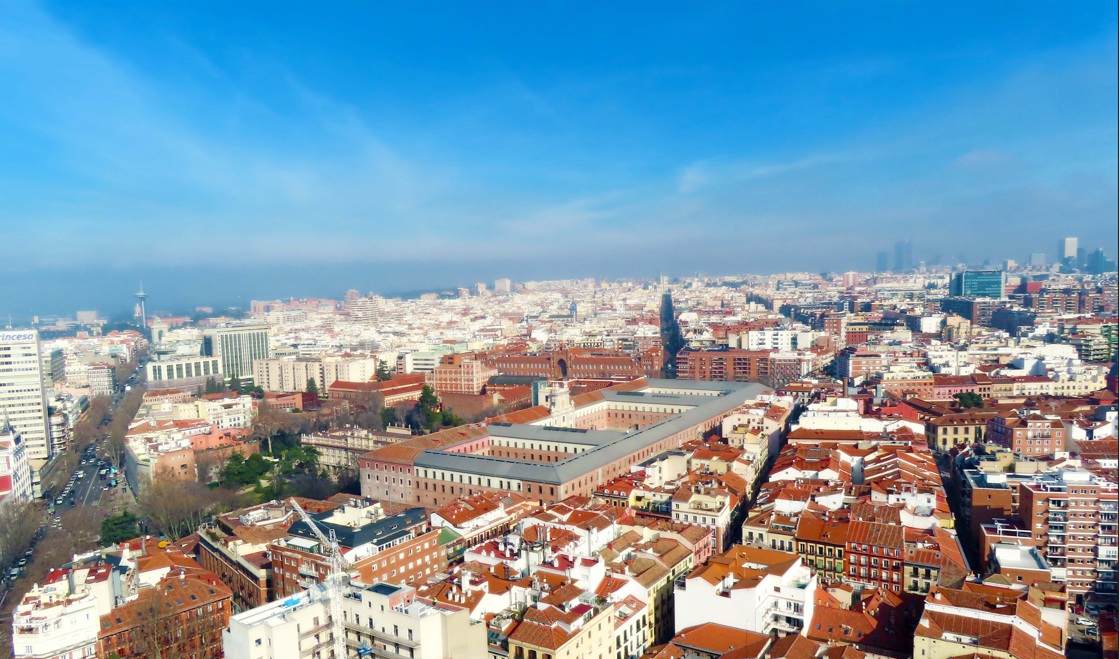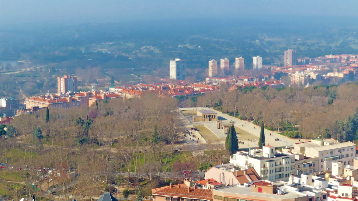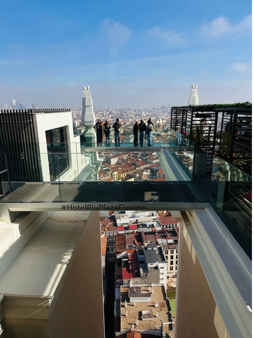 Hotel Riu Plaza de España. Ubicado en la Plaza de España e inaugurado en 2019, se ha convertido en poco tiempo en otro de los lugares que visitar en Madrid con mejores vistas. Subiendo en pocos segundos con el veloz ascensor hasta la planta 27 te darás cuenta del porqué de su nombre «De Madrid al Cielo», y es que su altura de 117 metros ofrece unas vistas de 360 grados de toda la capital que te dejarán sin palabras. Puedes desafiar tu vértigo cruzando una pasarela de cristal desde la que tendrás, literalmente, Madrid a tus pies. El único inconveniente es que la entrada cuesta 5 euros, pero vale la pena.