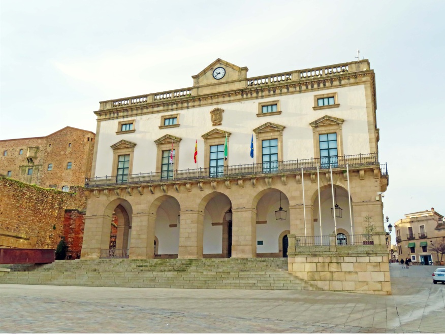 Ayuntamiento de Cáceres. Después de hacerte una foto en las famosas letras grandes de la ciudad, puedes empezar la visita a la Plaza Mayor por el Ayuntamiento. Construido entre 1867 y 1869, por el arquitecto vasco Ignacio María de Michelena en estilo neoclásico y con ciertas influencias del norte de España, este edificio preside la Plaza Mayor al encontrarse elevado sobre una escalinata. Merece la pena observar la fachada porticada con cinco arcos de medio punto, la balconada y el escudo de la ciudad de Cáceres, ubicado en la parte superior.