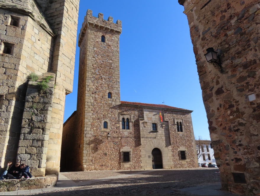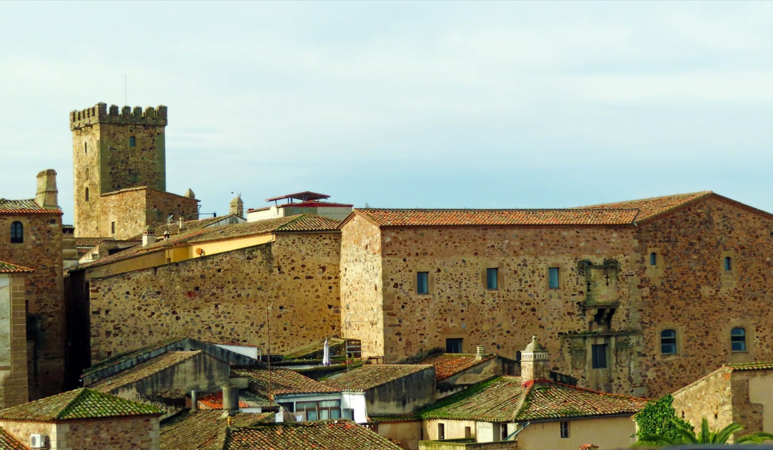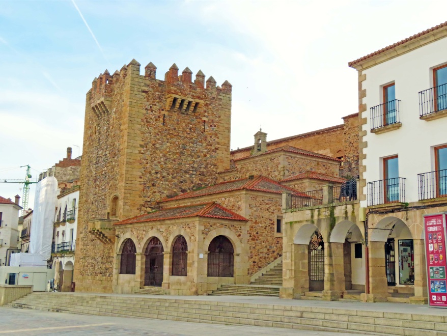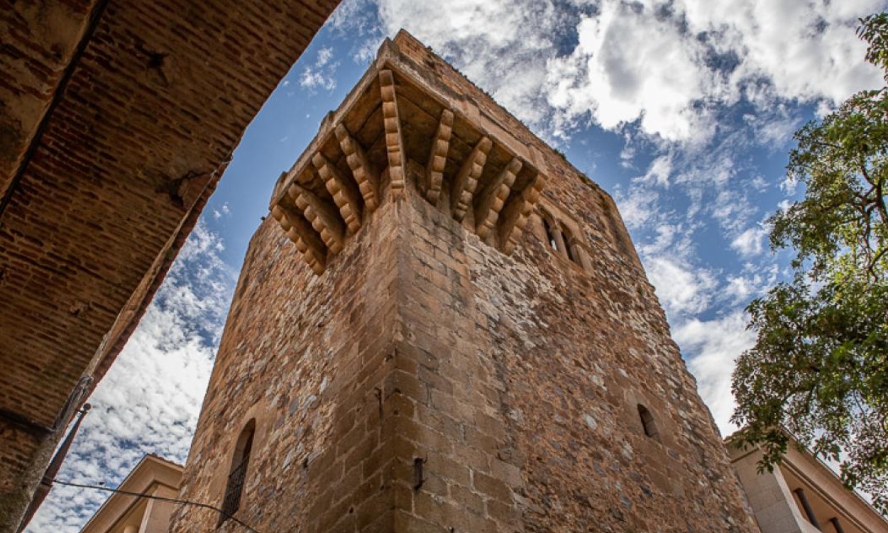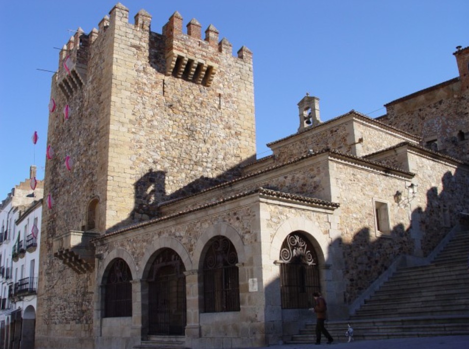 Torre de los Espaderos. Al salir del palacio puedes callejear por el centro histórico hasta la Torre de los Espaderos, situada en coqueta la plaza del Socorro. Situada junto a la puerta de Coria (la antigua puerta norte de la ciudad amurallada), esta esbelta torre de finales del siglo XV y de estilo castellano-mudéjar destaca por su excelente matacán esquinado ubicado en la parte superior.