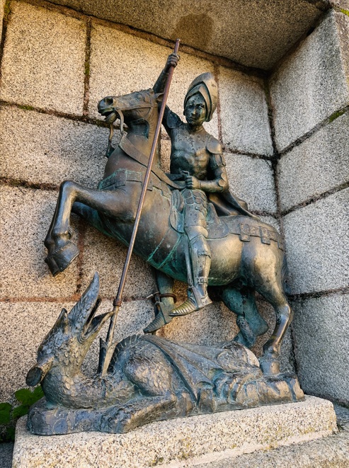 Plaza de San Jorge. La Plaza de San Jorge ofrece una de las postales más bonitas de Cáceres gracias a una fantásticas escalera monumental que finaliza en la entrada a la iglesia de San Francisco Javier, famosa por sus dos torres blancas que sobresalen de los tejados del centro histórico. Dedicada a San Jorge, patrón de Cáceres y cuya figura de bronce matando al dragón puedes ver en una de las paredes de la escalera, esta plaza está rodeada de la Casa de los Becerra (un palacio construido en el siglo XV en estilo gótico), los Jardines de Doña Cristina de Ulloa y el convento de la Compañía de Jesús.