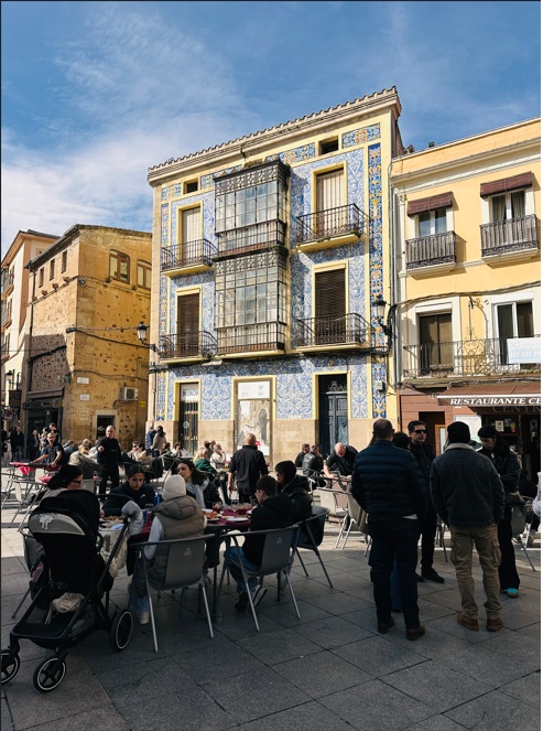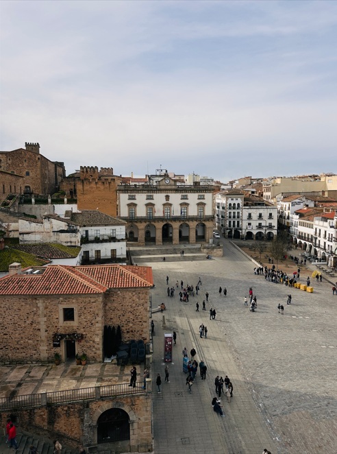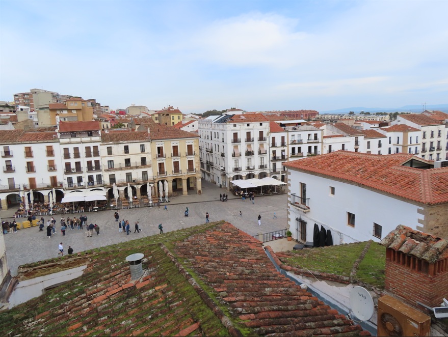 Plaza Mayor de Cáceres. Recorrer la comercial Calle Pintores, para entrar a la Plaza Mayor. Esta antigua plaza del mercado se rodeó durante el siglo XV de soportales apoyados en pilares de piedra y arcos de medio punto donde se han instalado numerosos bares y restaurantes donde tomar algo (tapa gratis incluida) con vistas al casco antiguo, convirtiéndose en el centro social de Cáceres.