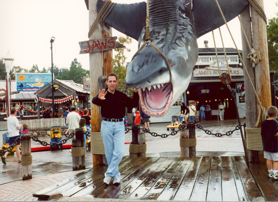 Ahora vamos a Jaws, hay que caminar mucho, es casi al otro lado del parque, este paseo tiene alrededor de 7 acres, en el trayecto veras muchos tiburones que pasan a unas 20 millas por hora, serás testigo de una gran mordida del bote por las mandíbulas del gran tiburón blanco, dura unos 7 minutos. De ahí pasamos a Earthquake – The Big One, basado en esa gran película, se preseleccionan unos voluntarios para participar de extras en el espectáculo, seremos testigos de un temblor de tierra de 2 minutos de duración y a 8.3 grados en la escala de Ritcher, dura unos 20 minutos.